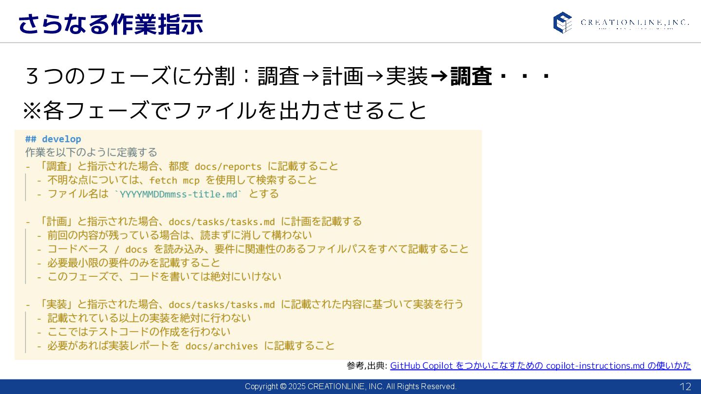 2025 CREATIONLINE, INC. All Rights Reserved. さらなる作業指示 12 3つのフェーズに分割:調査→計画→実装→調査・・・ ※各フェーズでファイルを出力させること 参考,出典: GitHub Copilot をつかいこなすための copilot-instructions.md の使いかた