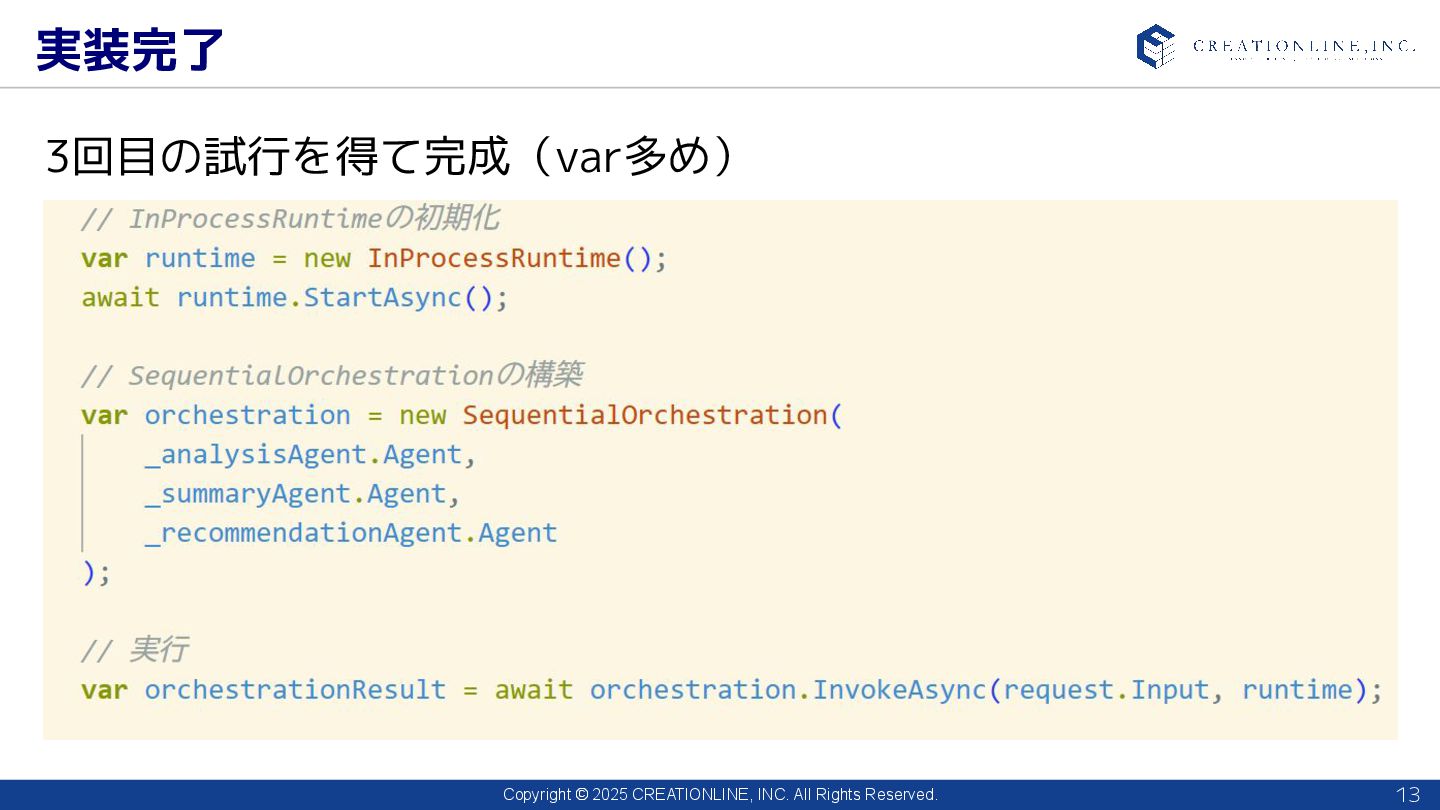 2025 CREATIONLINE, INC. All Rights Reserved. 実装完了 13 3回目の試行を得て完成(var多め)