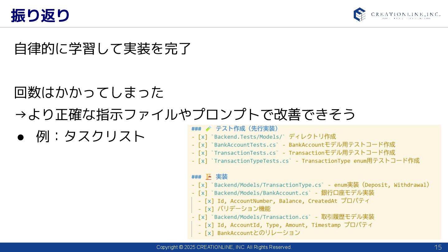 2025 CREATIONLINE, INC. All Rights Reserved. 振り返り 15 自律的に学習して実装を完了 回数はかかってしまった →より正確な指示ファイルやプロンプトで改善できそう • 例:タスクリスト
