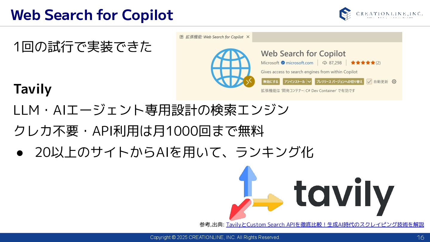 2025 CREATIONLINE, INC. All Rights Reserved. Web Search for Copilot 16 1回の試行で実装できた Tavily LLM・AIエージェント専用設計の検索エンジン クレカ不要・API利用は月1000回まで無料 • 20以上のサイトからAIを用いて、ランキング化 参考,出典: TavilyとCustom Search APIを徹底比較!生成AI時代のスクレイピング技術を解説