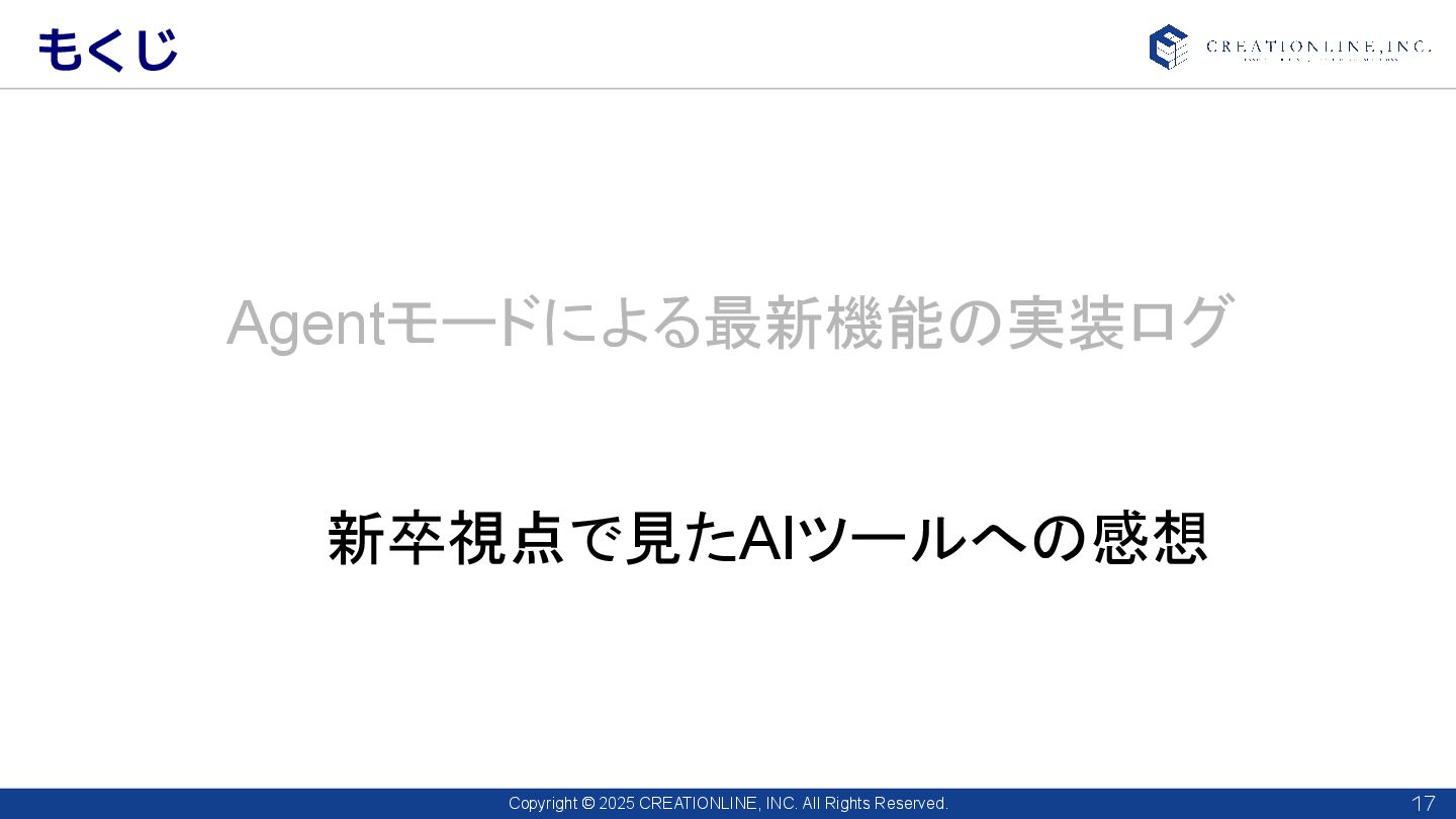 2025 CREATIONLINE, INC. All Rights Reserved. もくじ 17 Agentモードによる最新機能の実装ログ 新卒視点で見たAIツールへの感想