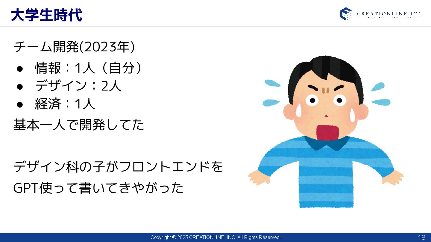 2025 CREATIONLINE, INC. All Rights Reserved. 大学生時代 18 チーム開発(2023年) • 情報:1人(自分) • デザイン:2人 • 経済:1人 基本一人で開発してた デザイン科の子がフロントエンドを GPT使って書いてきやがった