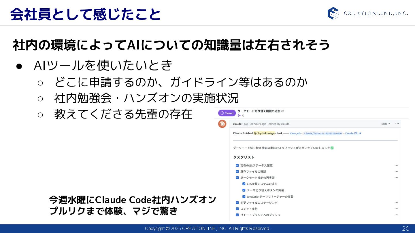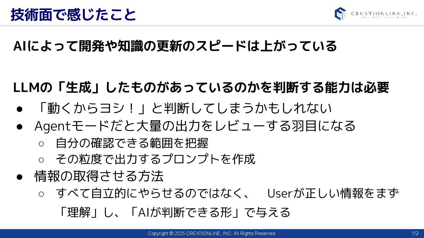 2025 CREATIONLINE, INC. All Rights Reserved. 技術面で感じたこと 19 AIによって開発や知識の更新のスピードは上がっている LLMの「生成」したものがあっているのかを判断する能力は必要 • 「動くからヨシ!」と判断してしまうかもしれない • Agentモードだと大量の出力をレビューする羽目になる ◦ 自分の確認できる範囲を把握 ◦ その粒度で出力するプロンプトを作成 • 情報の取得させる方法 ◦ すべて自立的にやらせるのではなく、 Userが正しい情報をまず 「理解」し、「AIが判断できる形」で与える