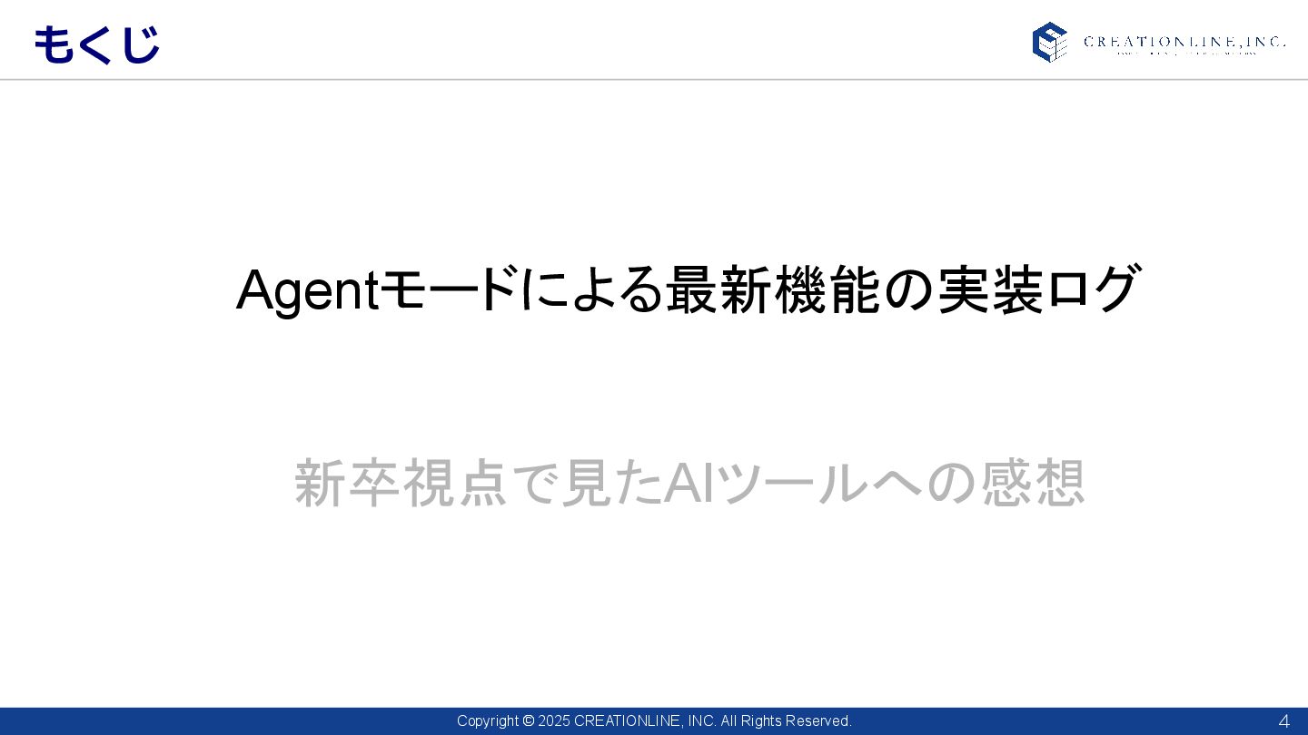 2025 CREATIONLINE, INC. All Rights Reserved. もくじ 4 Agentモードによる最新機能の実装ログ 新卒視点で見たAIツールへの感想