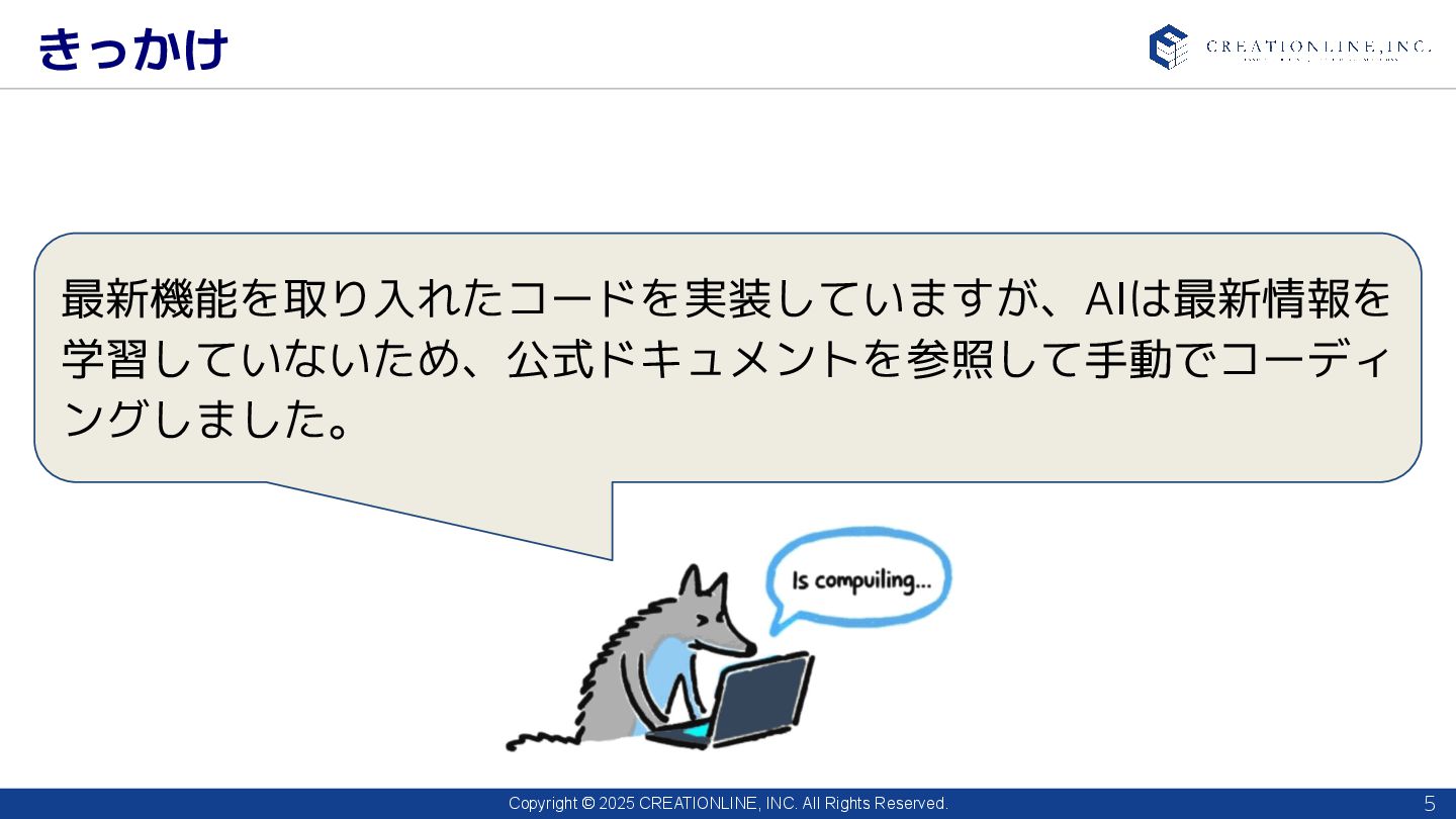2025 CREATIONLINE, INC. All Rights Reserved. きっかけ 5 最新機能を取り入れたコードを実装していますが、AIは最新情報を 学習していないため、公式ドキュメントを参照して手動でコーディ ングしました。