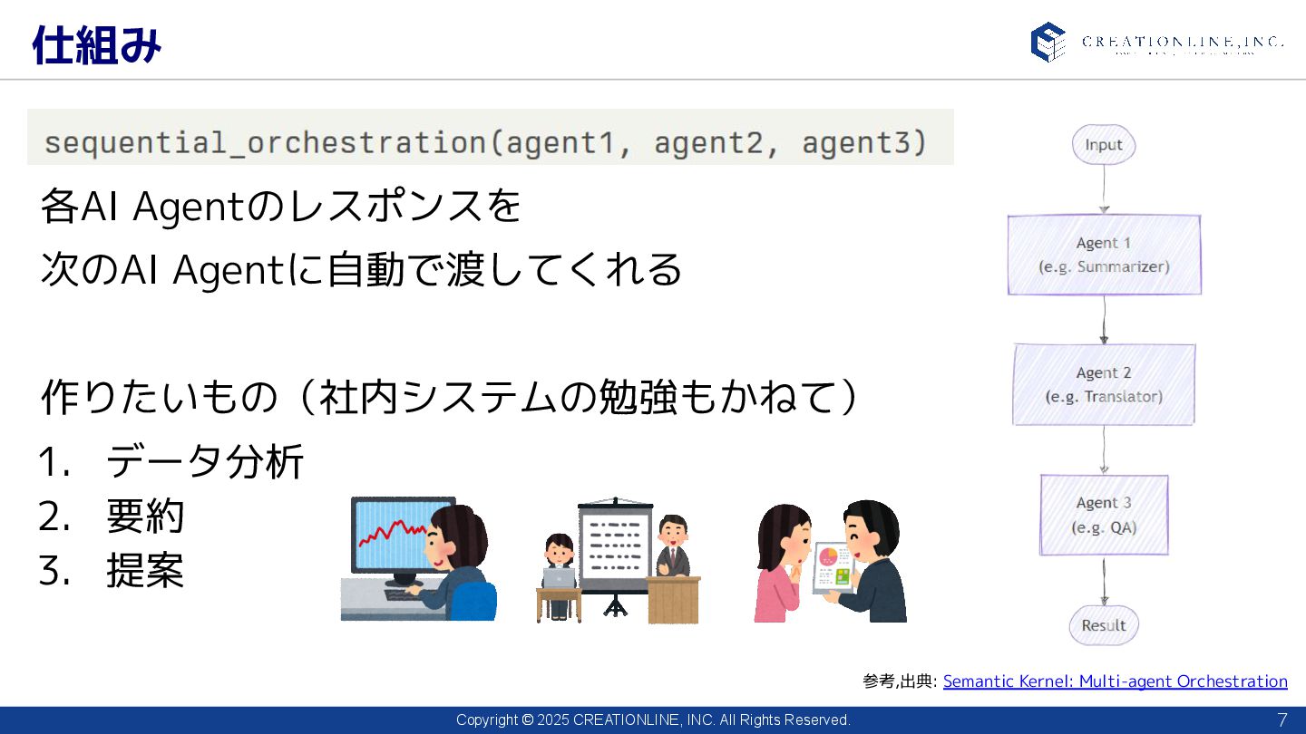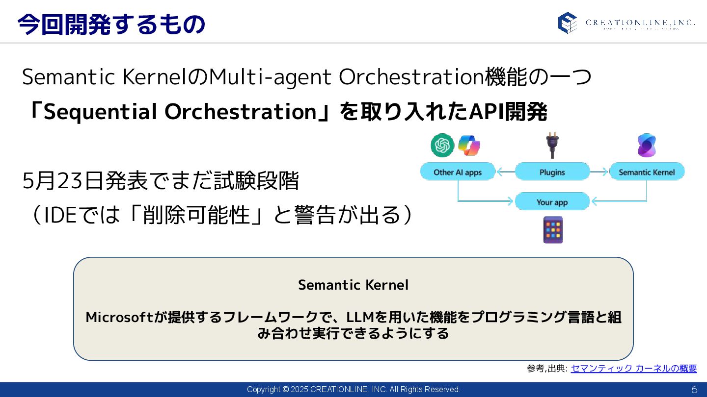 2025 CREATIONLINE, INC. All Rights Reserved. 今回開発するもの 6 Semantic KernelのMulti-agent Orchestration機能の一つ 「Sequential Orchestration」を取り入れたAPI開発 5月23日発表でまだ試験段階 (IDEでは「削除可能性」と警告が出る) Semantic Kernel Microsoftが提供するフレームワークで、LLMを用いた機能をプログラミング言語と組 み合わせ実行できるようにする 参考,出典: セマンティック カーネルの概要