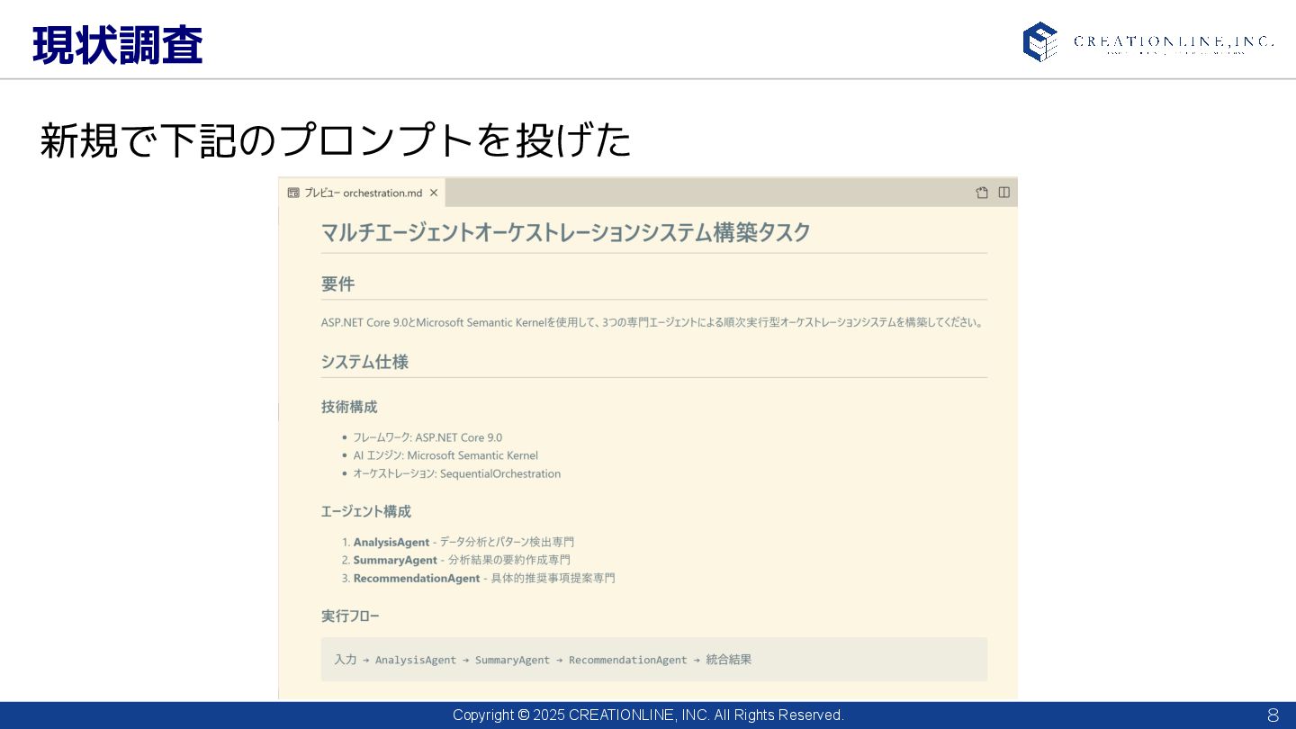 2025 CREATIONLINE, INC. All Rights Reserved. 現状調査 8 新規で下記のプロンプトを投げた