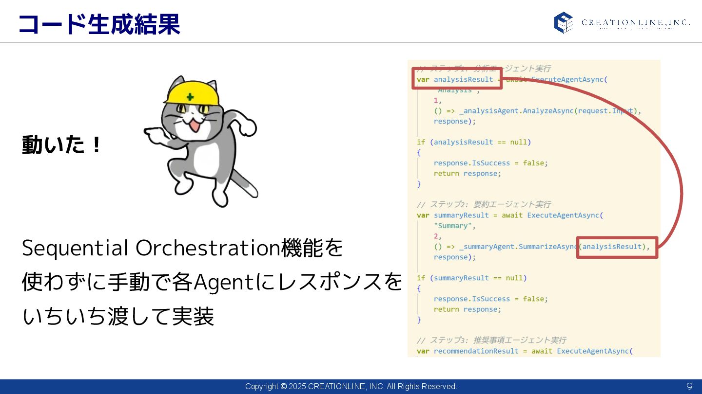 2025 CREATIONLINE, INC. All Rights Reserved. コード生成結果 9 動いた! Sequential Orchestration機能を 使わずに手動で各Agentにレスポンスを いちいち渡して実装