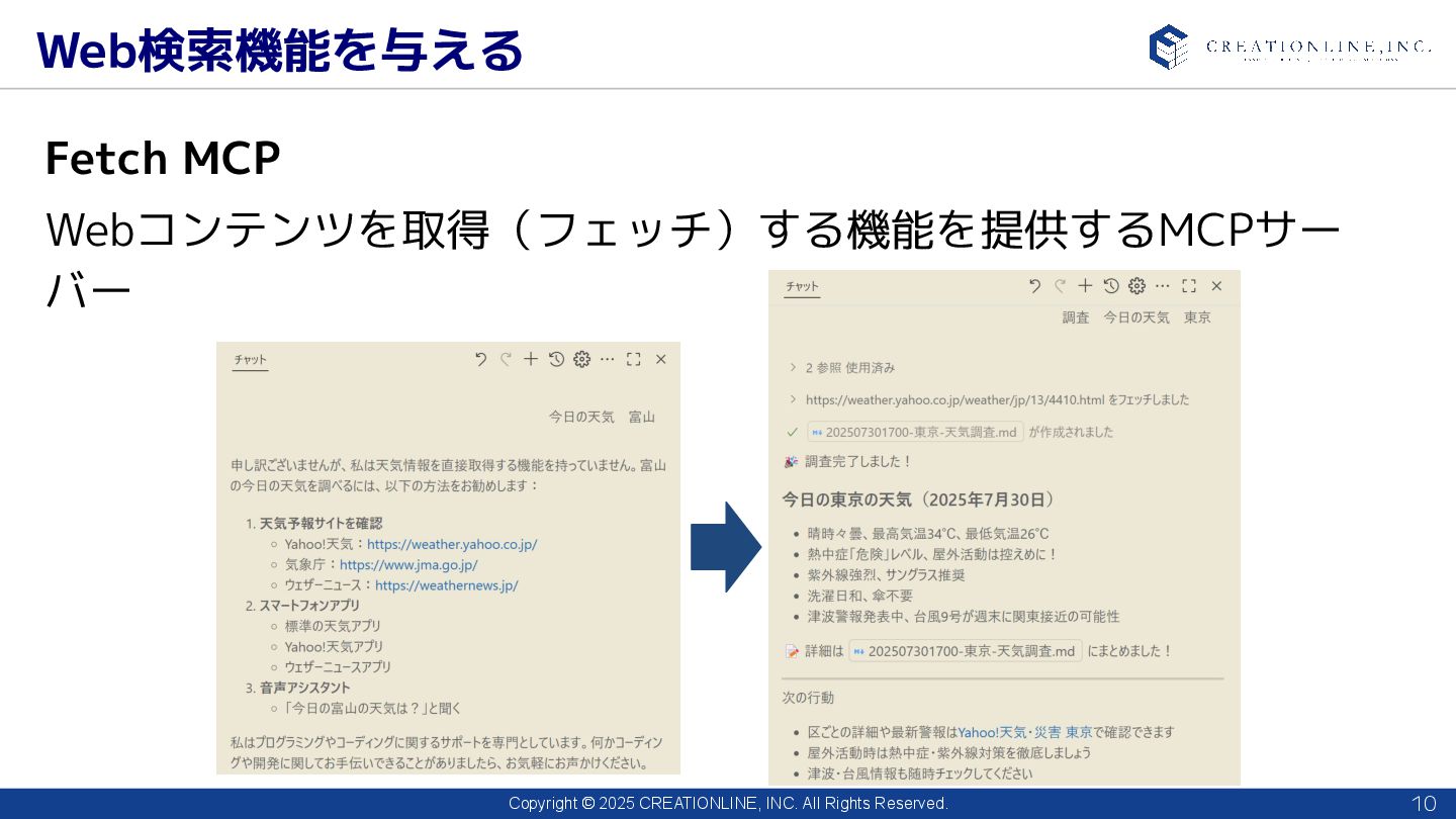 2025 CREATIONLINE, INC. All Rights Reserved. Web検索機能を与える 10 Fetch MCP Webコンテンツを取得(フェッチ)する機能を提供するMCPサー バー