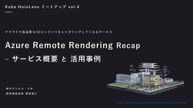 デ ジ タ ル ・ ラ ボ 新 事 業 創 造 係 堀 尾 風 仁 K o b e H o l o L e n s ミ ー ト ア ッ プ v o l . 4 ク ラ ウ ド で 高 品 質 な 3 D コ ン テ ン ツ を レ ン ダ リ ン グ し て く れ る サ ー ビ ス https://azure.microsoft.com/ja-jp/services/remote-rendering/