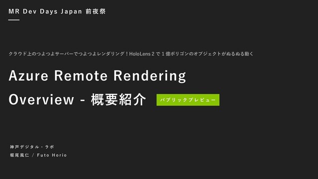 タ ル ・ ラ ボ 堀 尾 風 仁 / F u t o H o r i o M R D e v D a y s J a p a n 前 夜 祭 クラウド上のつよつよサーバーでつよつよレンダリング!HoloLens 2 で 1 億ポリゴンのオブジェクトがぬるぬる動く パ ブ リ ッ ク プ レ ビ ュ ー