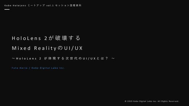 . K o b e H o l o L e n s ミ ー ト ア ッ プ v o l . 1 セ ッ シ ョ ン 登 壇 資 料 H o l o L e n s 2 が 破 壊 す る M i x e d R e a l i t y の U I / U X ~ H o l o L e n s 2 が 体 現 す る 次 世 代 の U I / U X と は ? ~ F u t o H o r i o / K o b e D i g i t a l L a b o I n c .