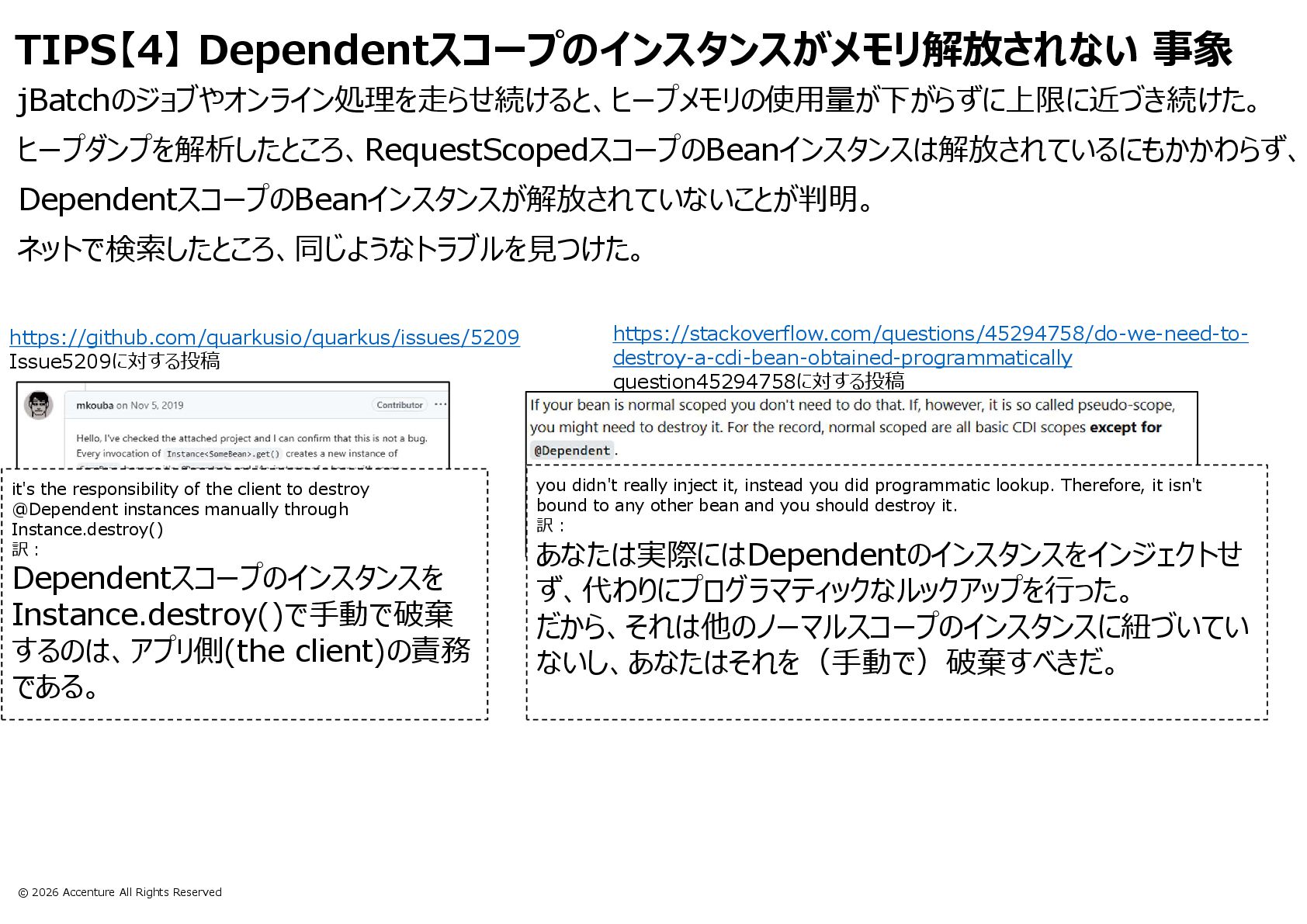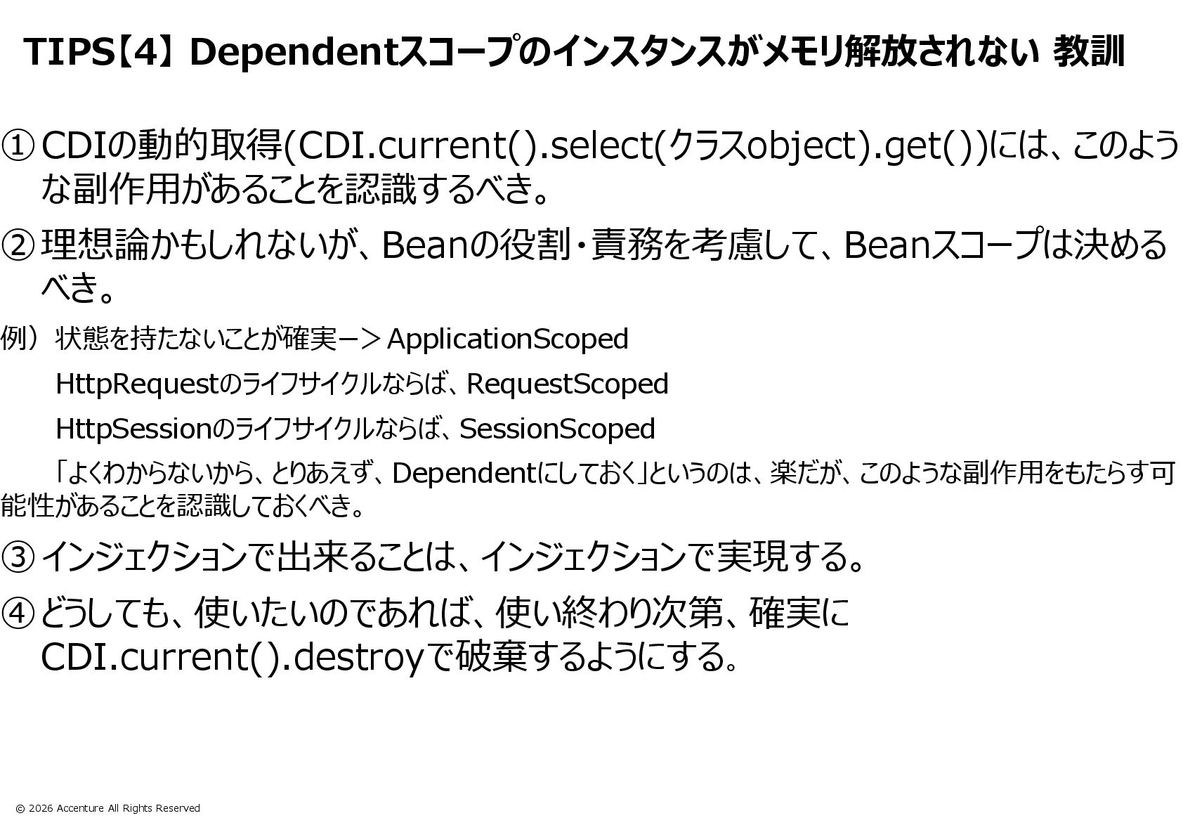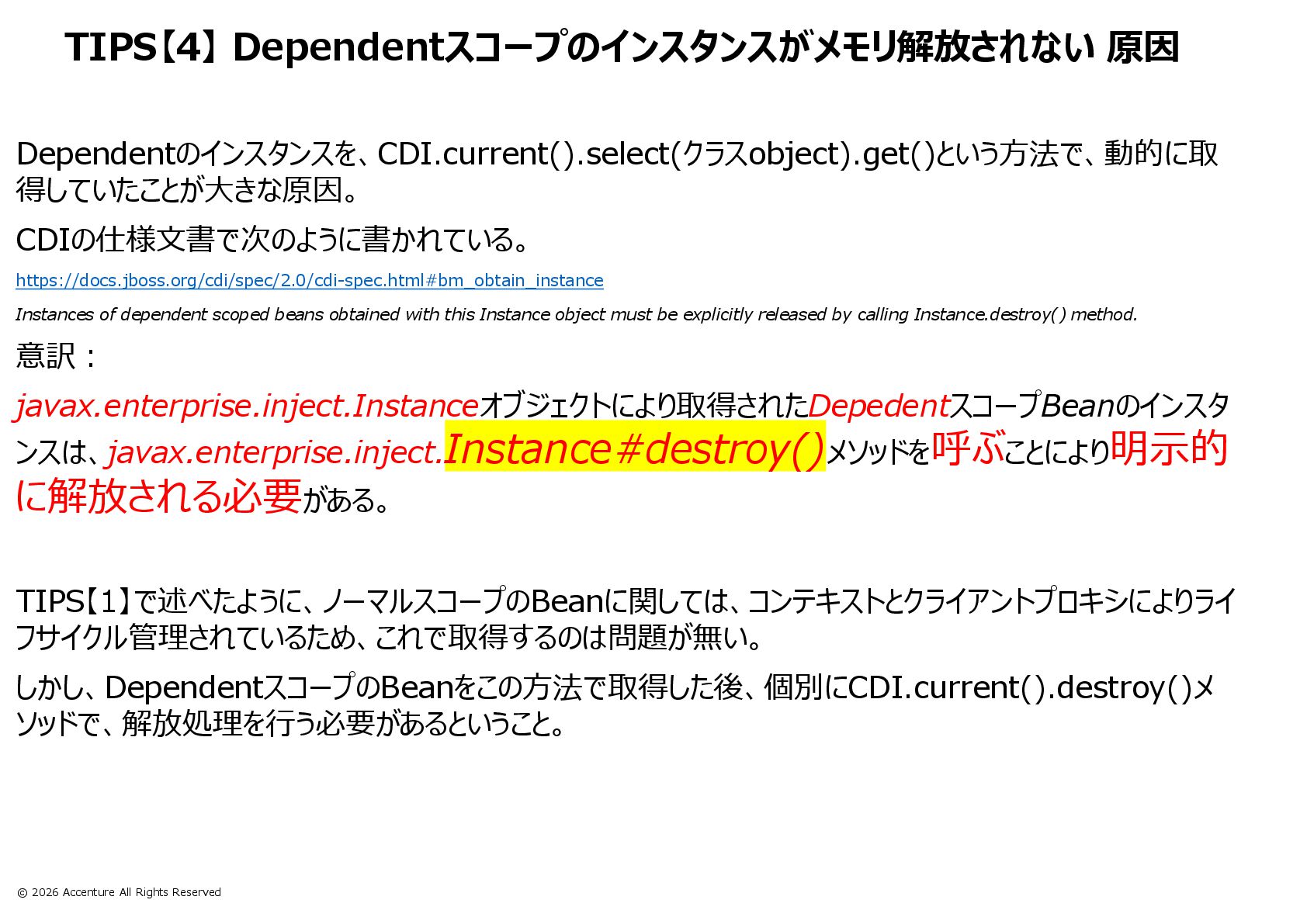 TIPS【4】 CDI.current().select().get()で取得したDependentスコープのインスタンスがメモリ解放されない