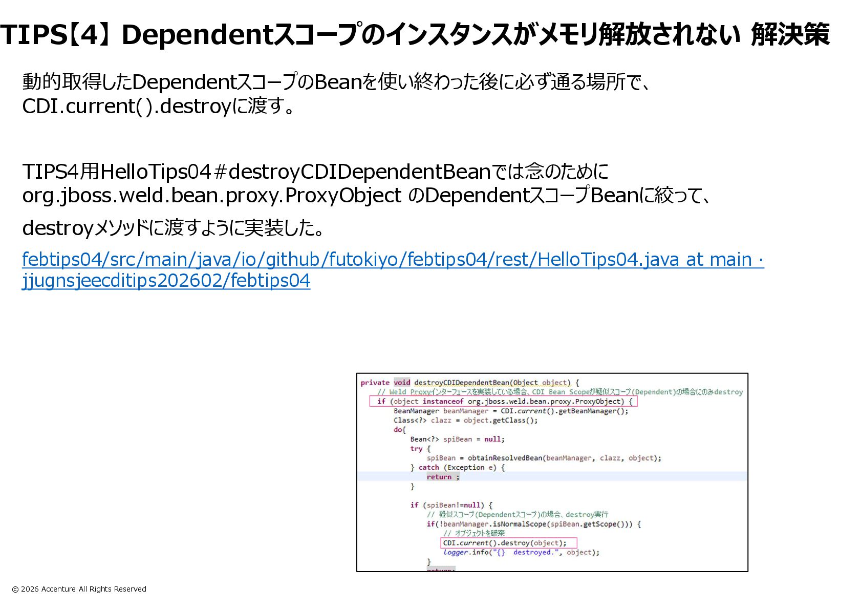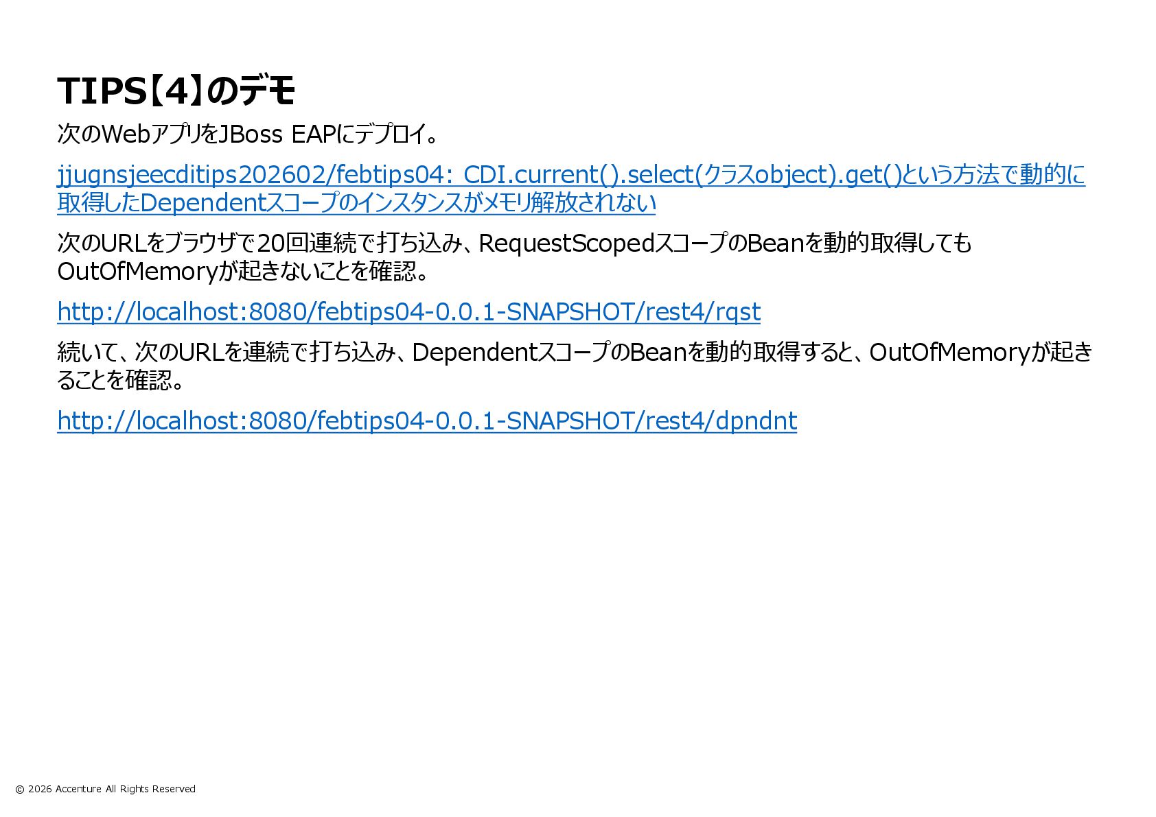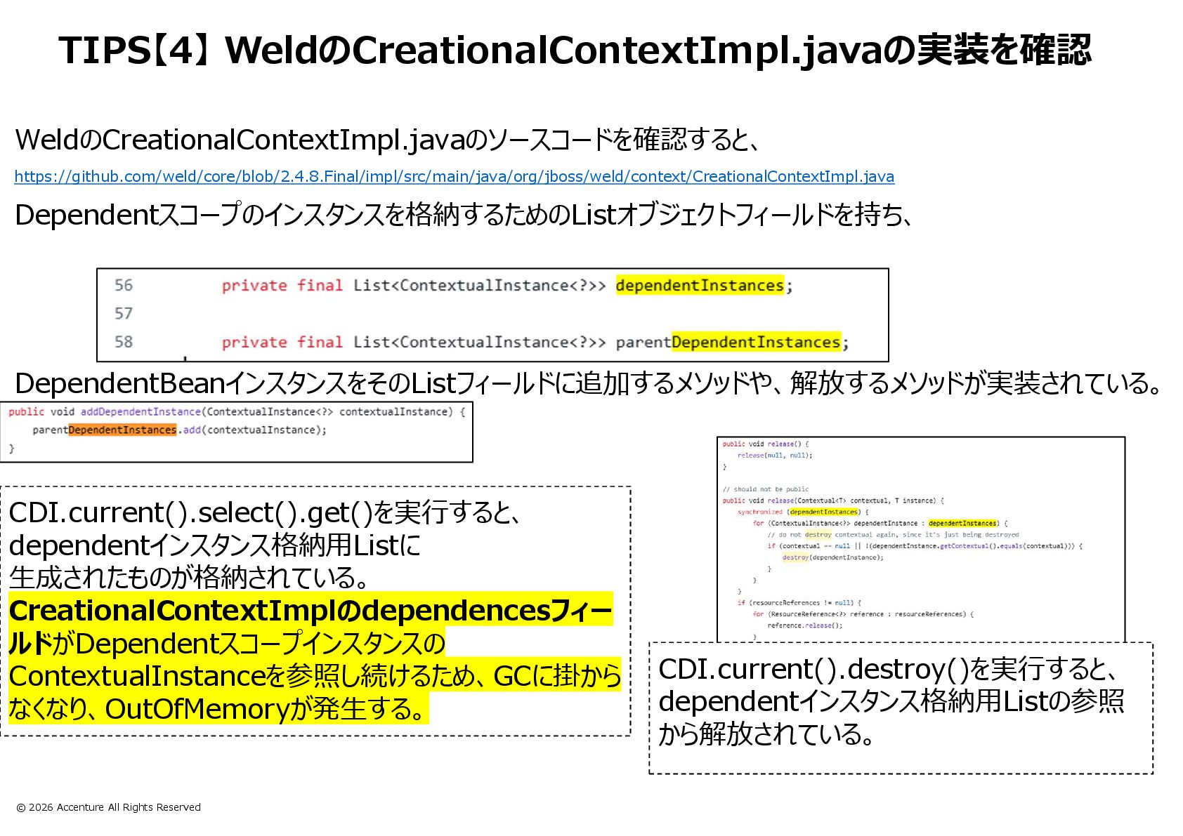 TIPS【4】 CDI.current().select().get()で取得したDependentスコープのインスタンスがメモリ解放されない
