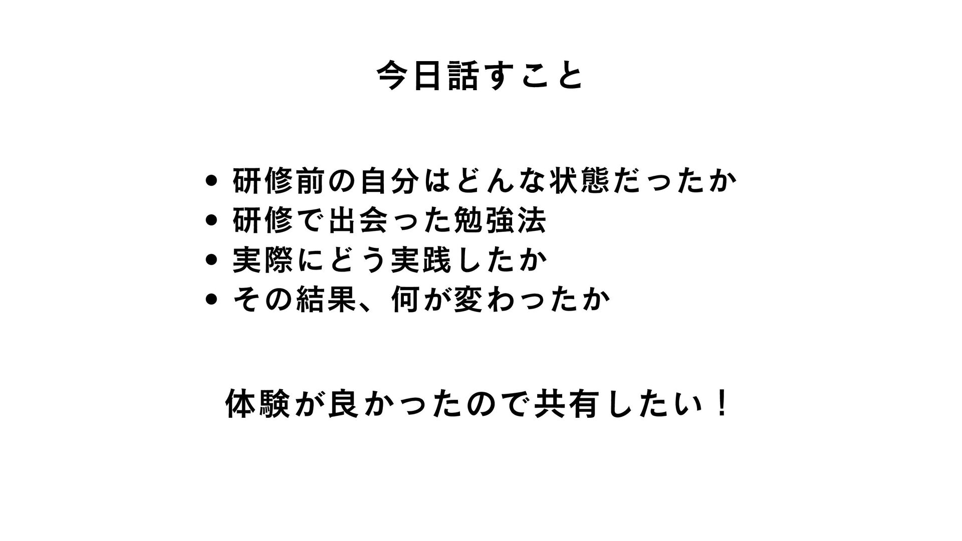 今日話すこと 研修前の自分はどんな状態だったか 研修で出会った勉強法 実際にどう実践したか その結果、何が変わったか 体験が良かったので共有したい!