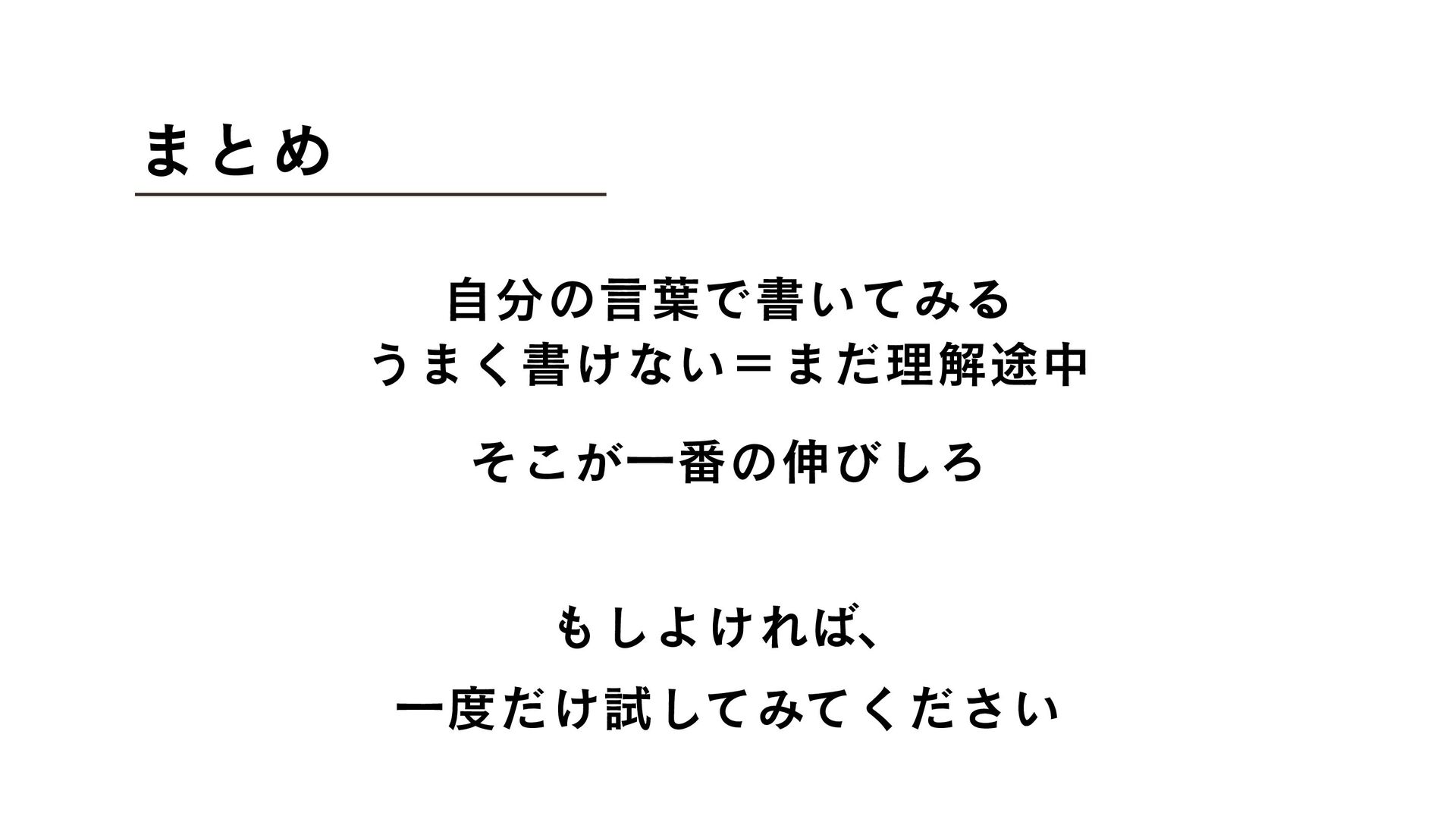 まとめ 自分の言葉で書いてみる うまく書けない=まだ理解途中 そこが一番の伸びしろ もしよければ、 一度だけ試してみてください