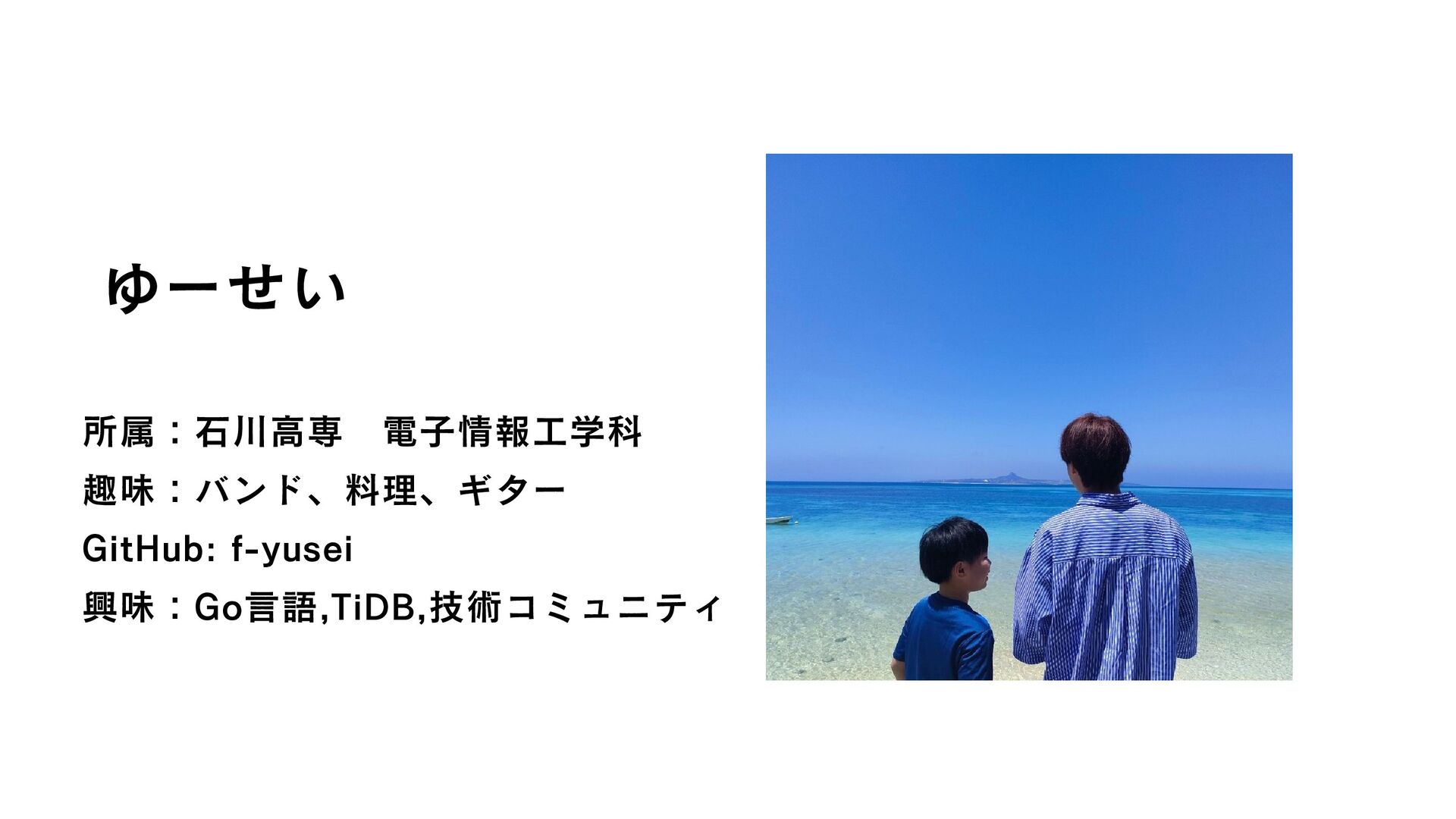 所属:石川高専 電子情報工学科 趣味:バンド、料理、ギター GitHub: f-yusei 興味:Go言語,TiDB,技術コミュニティ ゆーせい