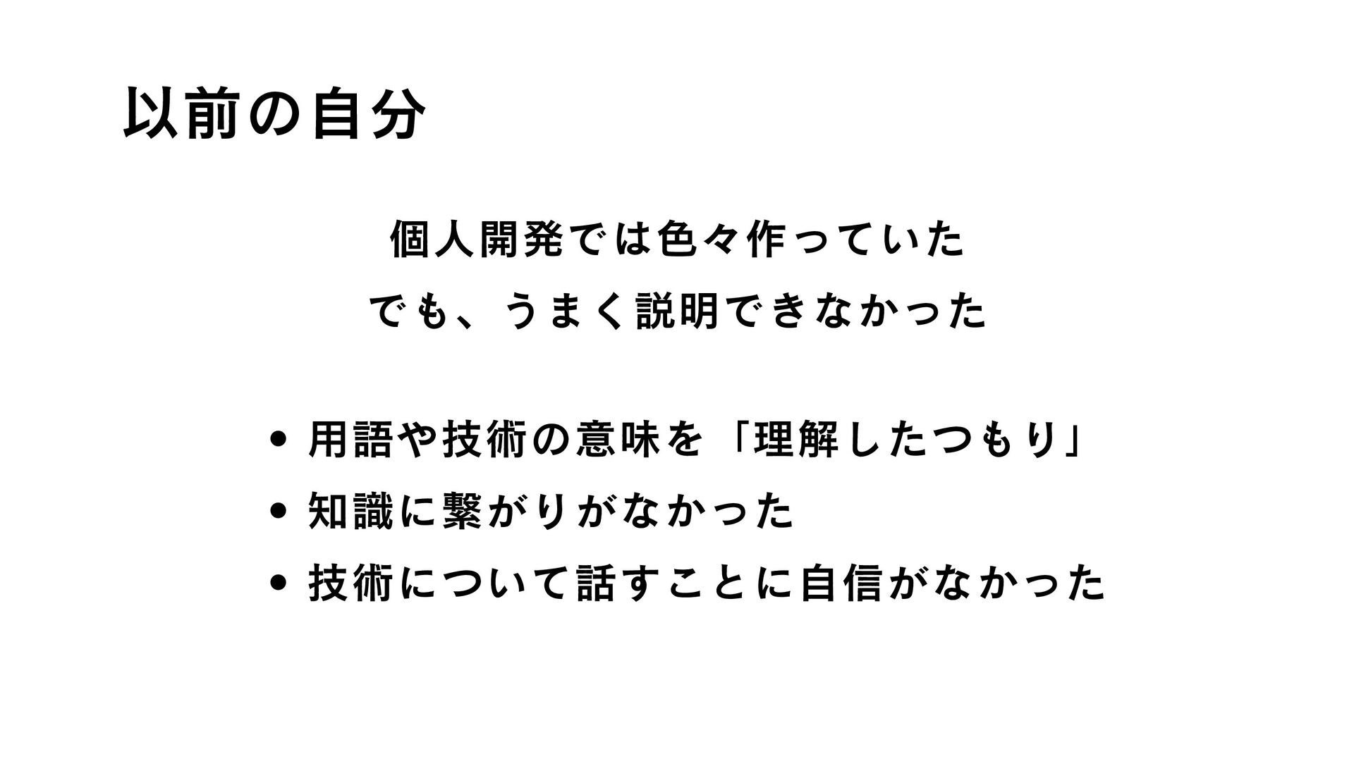 以前の自分 個人開発では色々作っていた でも、うまく説明できなかった 用語や技術の意味を「理解したつもり」 知識に繋がりがなかった 技術について話すことに自信がなかった