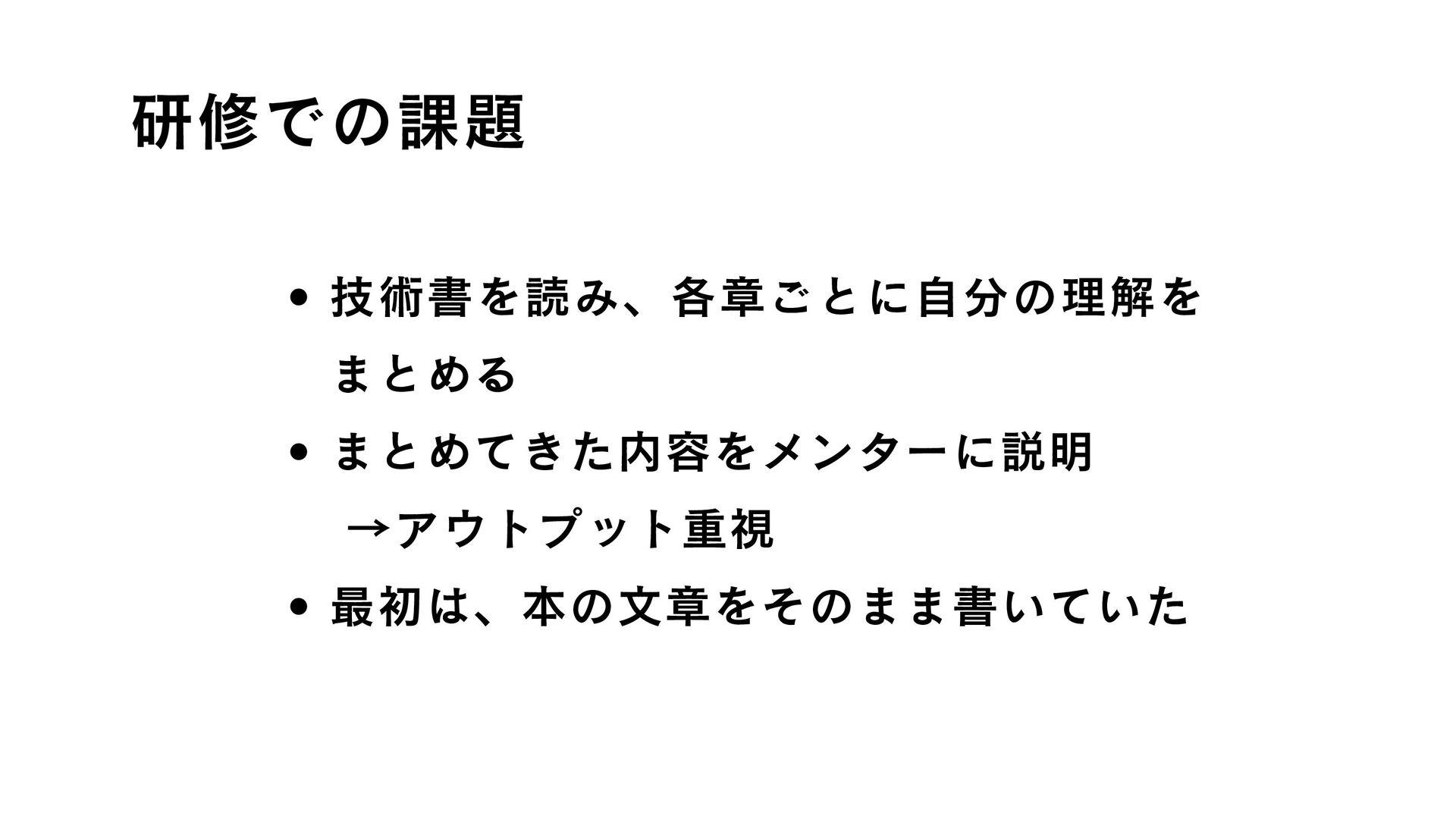 研修での課題 技術書を読み、各章ごとに自分の理解を まとめる まとめてきた内容をメンターに説明 →アウトプット重視 最初は、本の文章をそのまま書いていた