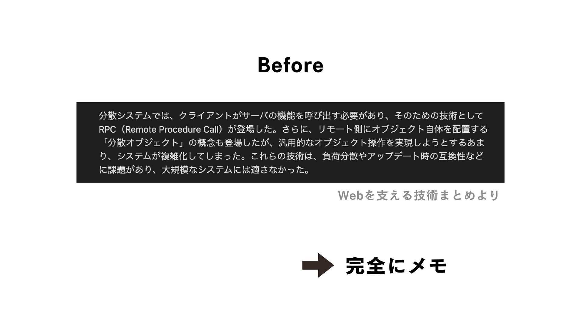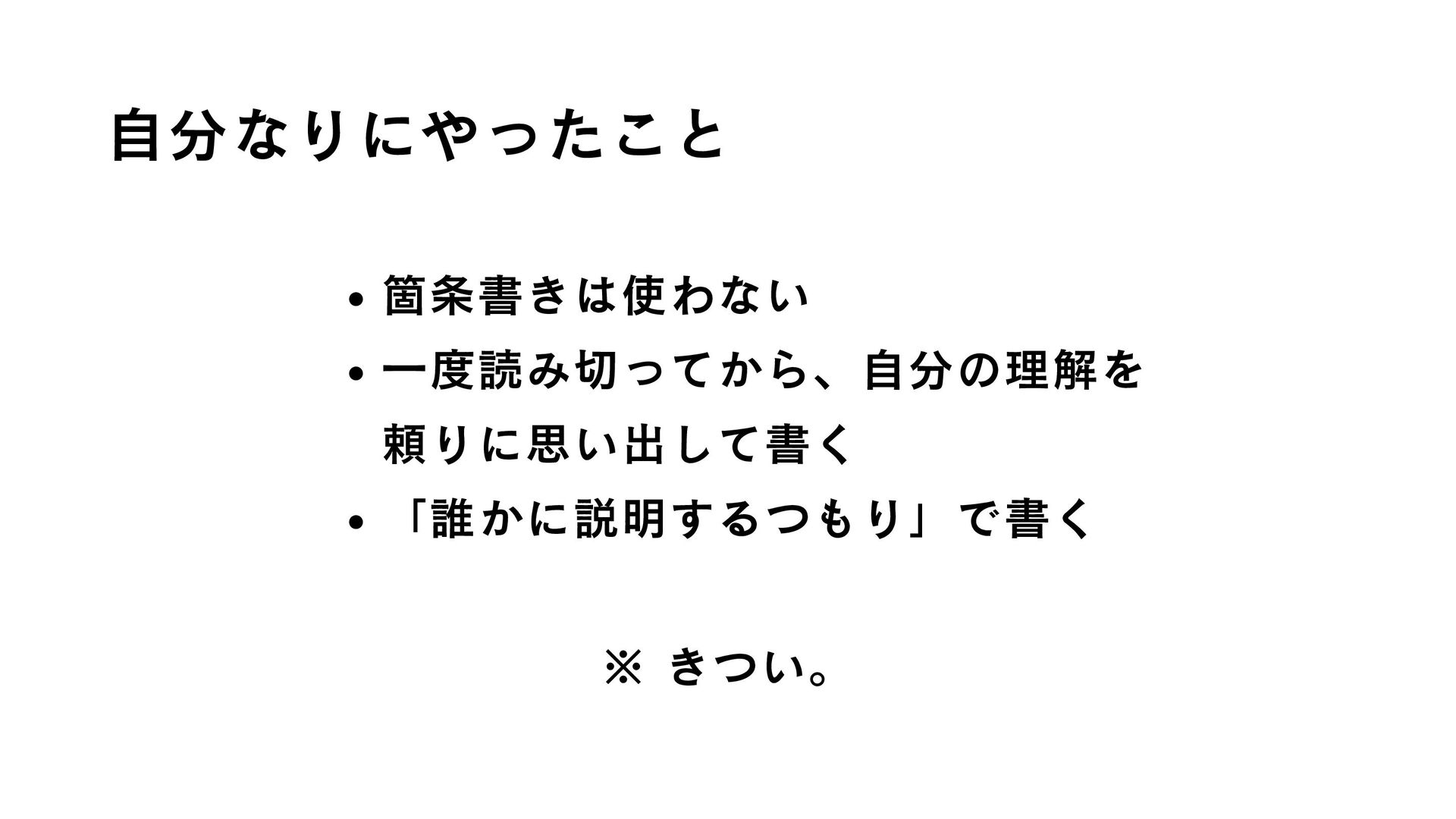 自分なりにやったこと 箇条書きは使わない 一度読み切ってから、自分の理解を 頼りに思い出して書く 「誰かに説明するつもり」で書く ※ きつい。