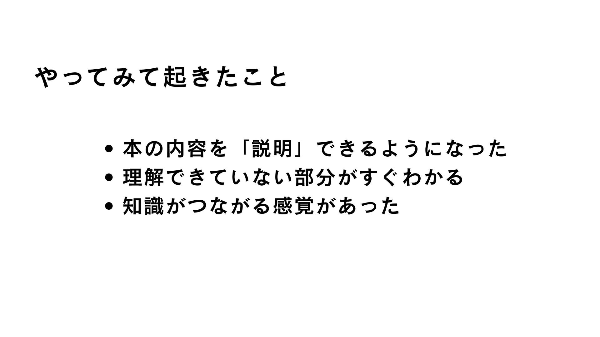 やってみて起きたこと 本の内容を「説明」できるようになった 理解できていない部分がすぐわかる 知識がつながる感覚があった