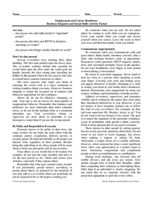 Activity Packet Name Date_______________ Period_____________ Employment and Career Readiness: Business Etiquette and Social Skills Activity Packet Are you… …that person who only talks nicely to “important” people? …that person who does not RSVP to business meetings or events? …that person who brings smelly lunches to work? Don’t be that person! Several co-workers were entering their office building. The first man pushed open the heavy door. The co-worker walking behind him assumed he would hold open the door until she could grab the handle. Instead, the door swung shut, knocking her folders to the ground. Don’t be that person who fails to extend basic common courtesies to others. The term etiquette may make you think of choosing the correct fork at a fancy restaurant or writing countless thank you notes. However, business etiquette is simply the accepted set of manners and behaviors appropriate for the workplace. Above all, do not be offensive, immature, or rude. Your age is not an excuse for unacceptable or inappropriate behavior. Remember that kindness and politeness are more important than minor etiquette errors, so do not let the multiple forks at a restaurant intimidate you. Your co-workers, clients, or supervisor are more likely to remember if you disrespect a waiter than if you use the wrong utensil. Be Polite and Respectful to Everyone Everyone knows to be polite to their boss, but many workers do not make the same effort with the company janitor, receptionist, delivery person, or security guard. Be kind and friendly to all people you interact with, regardless of their position. Besides being the right thing to do, these people will be more likely to help you and speak well of you in return. Treat others as you would like to be treated. For example, do not jam the copy machine and leave it for the next person to fix. Admit and correct your mistakes, especially if they impact others. Remember that what goes around comes around. If you persistently spread rumors, eavesdrop, or gossip about others, be prepared for the backlash. If you only talk to a co-worker when you need help, do not be surprised if he or she begins avoiding you. Be courteous when you are sick. Do not infect others by coming to work while you are contagious. Cover your mouth when you cough and excuse yourself when you sneeze. Leave the room to blow your nose and then thoroughly wash your hands. Communicate Appropriately Be courteous when you communicate with and greet others. Shake hands, introduce yourself, offer a chair, and exchange business cards, as appropriate. Respond to verbal questions, RSVP requests, emails, texts, and voicemails promptly. Focus on the speaker. Do not wear headphones, text, fidget, or look around or down during a conversation. Be aware of your body language. Never stand or lean too close to a person when speaking or point your finger. Crossing your arms and leaning away can appear defensive or hostile. Slumping in a chair or resting your head in your hands shows disinterest. Instead, demonstrate your engagement by using eye contact, nodding, and maintaining a friendly posture. Address co-workers, supervisors, and customers verbally and in writing by the names they used when they introduced themselves to you. However, if you are unsure or have forgotten, politely ask or follow the lead of your co-workers. For example, do they call your supervisor Mr. Morales, Javier, or sir? You do not want to be too formal or too casual. The goal is to match the standards of the particular workplace. Learn to pronounce each person’s name correctly. Write it down phonetically if you need a reminder. Show interest in other people by asking general, but not overly personal, questions about them. Do not swear or use racist or sexist language. Say please when making a request or asking for help. Afterwards, a simple thank you is usually sufficient. However, when someone has done a more significant favor, show your appreciation in a written email or letter. Graciously congratulate and compliment people on their accomplishments or contributions. During work meetings, stay focused, turn off mobile devices, and put away any snacks. Give people enough time to finish their thoughts, rather than completing their sentences or interrupting them. Offer help if an individual is clearly struggling. Do not stand idly by as someone wrestles with the projection equipment or spills his or her coffee.