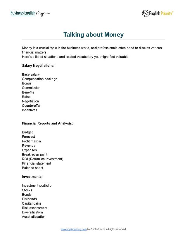 business world, and professionals often need to discuss various financial matters. Here's a list of situations and related vocabulary you might find valuable: Salary Negotiations: Base salary Compensation package Bonus Commission Benefits Raise Negotiation Counteroffer Incentives Financial Reports and Analysis: Budget Forecast Profit margin Revenue Expenses Break-even point ROI (Return on Investment) Financial statement Balance sheet Investments: Investment portfolio Stocks Bonds Dividends Capital gains Risk assessment Diversification Asset allocation www.englishpriority.com by GabbyRincon All rights reserved.