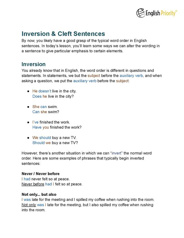 this structure? When you want to emphasize the negative expression at the beginning of the sentence. For example, when we compare: • I had never felt so at peace. • Never before had I felt so at peace. The first sentence focuses more on the feeling of peace, whereas the second sentence focuses more on the fact that I had NEVER had this feeling before. Here’s another example: • After I moved out, I understood how dysfunctional my family was. • Not until I moved out did I understand how dysfunctional my family was. The first sentence focuses more on the new understanding. The second sentence places more emphasis on the timing before arriving at this new understanding. ________________________________ The phrase “not only… but also…” functions to emphasize the second phrase as even better or worse than the first: 1- I was late for the meeting and I spilled my coffee when rushing into the room. In this sentence, both “being late” and “spilling the coffee” are treated as approximately equal 2- Not only was I late for the meeting, but I also spilled my coffee when rushing into the room. In this sentence, “being late for the meeting” is the less bad action, and “spilling my coffee” is the worst action – perhaps because it’s more embarrassing.