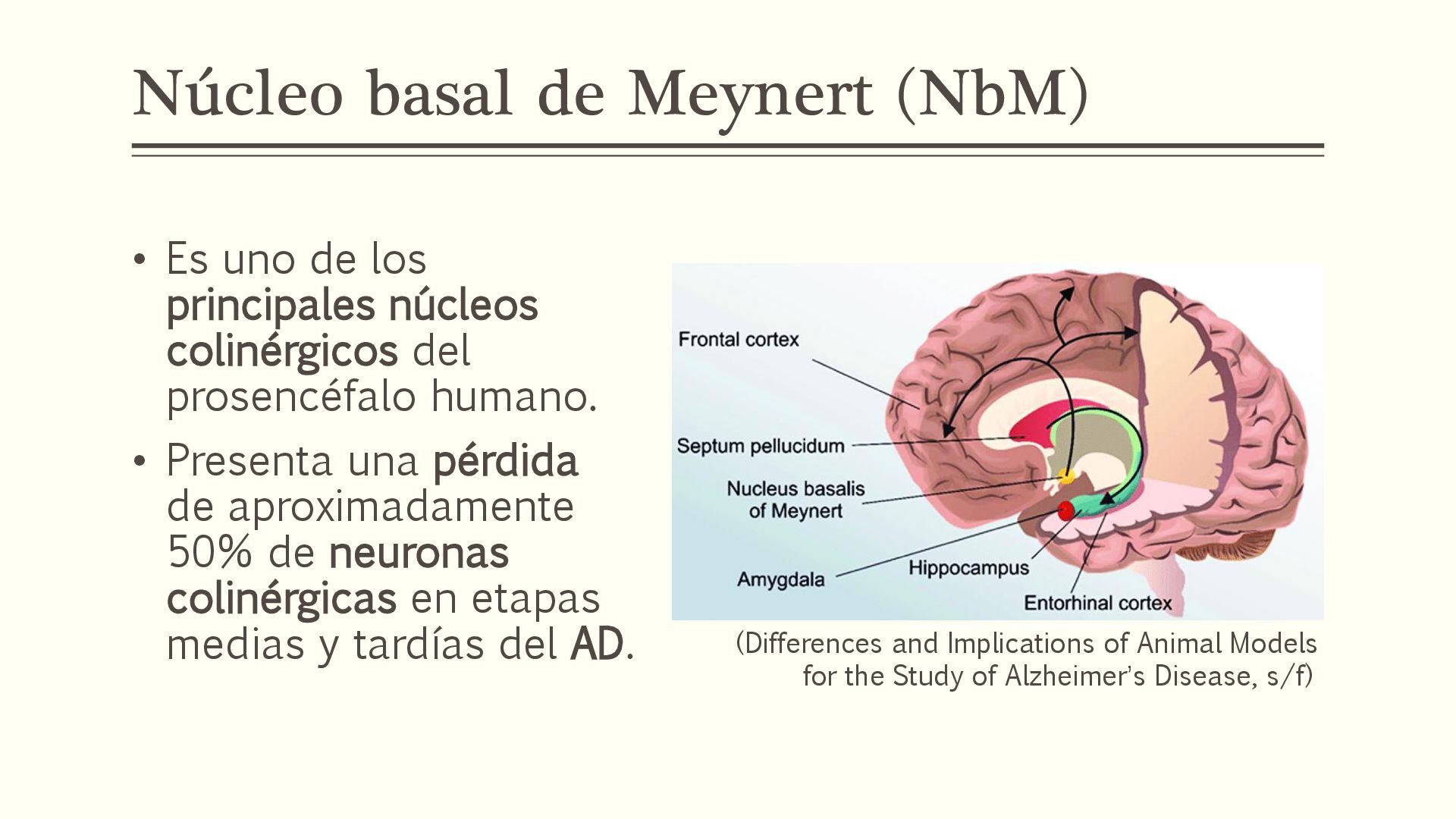 principales núcleos colinérgicos del prosencéfalo humano. • Presenta una pérdida de aproximadamente 50% de neuronas colinérgicas en etapas medias y tardías del AD. (Differences and Implications of Animal Models for the Study of Alzheimerʼs Disease, s/f)