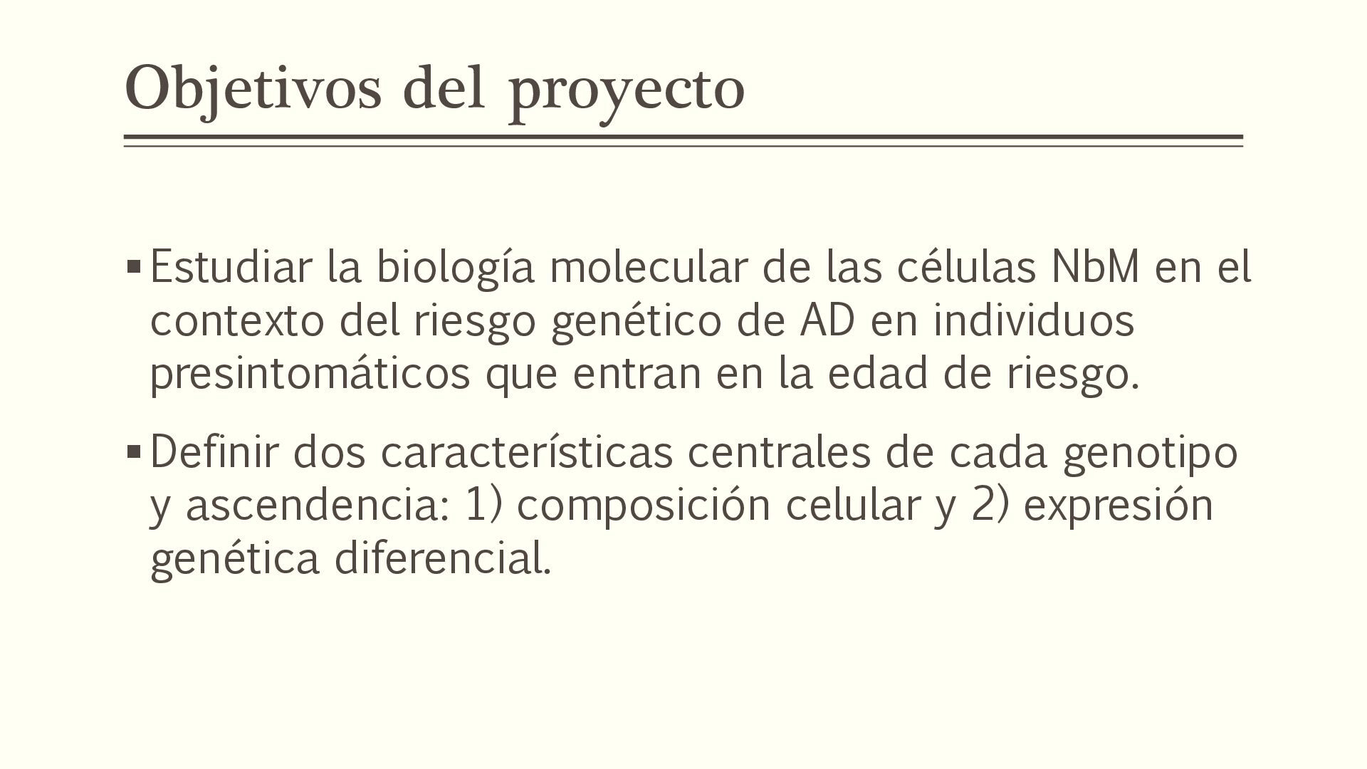 NbM en el contexto del riesgo genético de AD en individuos presintomáticos que entran en la edad de riesgo. ▪Definir dos características centrales de cada genotipo y ascendencia: 1) composición celular y 2) expresión genética diferencial.