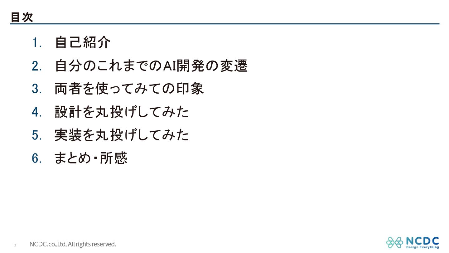 目次 2 1. 自己紹介 2. 自分のこれまでのAI開発の変遷 3. 両者を使ってみての印象 4. 設計を丸投げしてみた