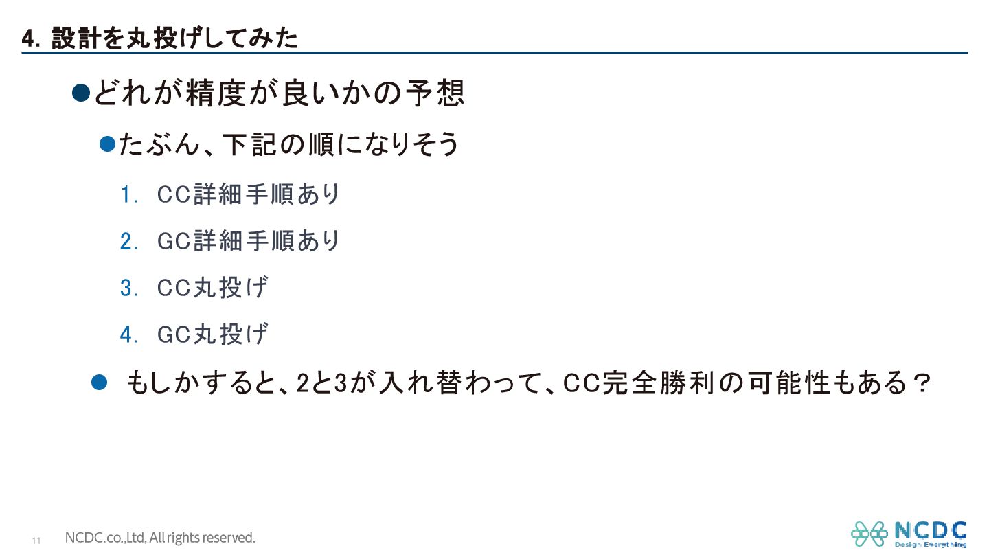 4. 設計を丸投げしてみた 11 ⚫どれが精度が良いかの予想 ⚫たぶん、下記の順になりそう 1. CC詳細手順あり 2. GC詳細手順あり 3.