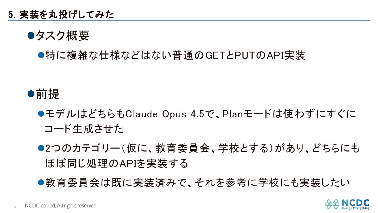 4. 設計を丸投げしてみた 12 ⚫結果 ⚫どれもそんなに大差なくて、丸投げしてから手直しするでも全然良いかも しれない ⚫むしろ、丸投げの方が広くドキュメントやコードベースを広く探索するので、 そっちの方が良い点もあった ⚫結局、4つ全てを読み込ませて、いいとこ取りした最適なものを採用した CC丸投げ