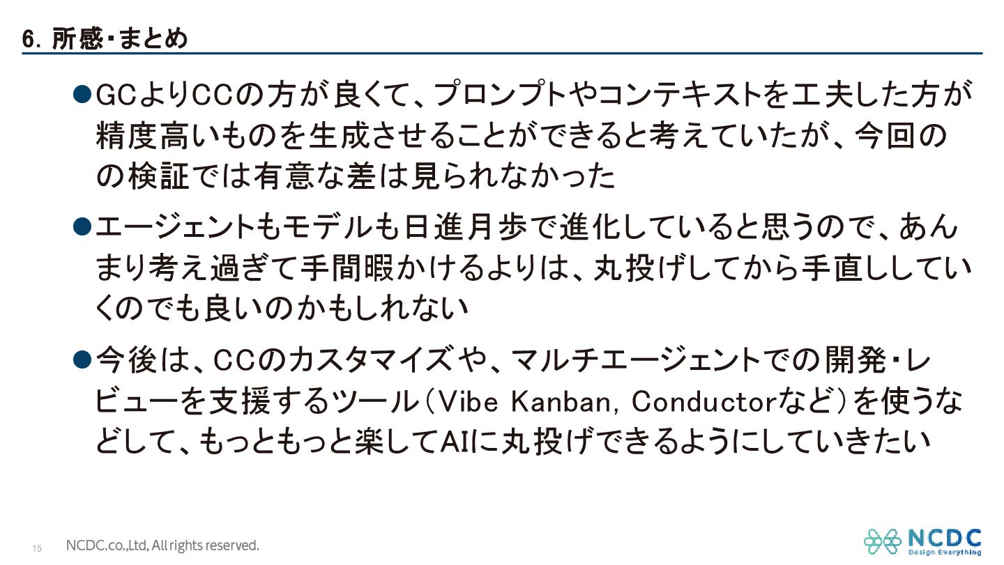 6. 所感・まとめ 15 ⚫GCよりCCの方が良くて、プロンプトやコンテキストを工夫した方が 精度高いものを生成させることができると考えていたが、今回の の検証では有意な差は見られなかった ⚫エージェントもモデルも日進月歩で進化していると思うので、あん まり考え過ぎて手間暇かけるよりは、丸投げしてから手直ししてい くのでも良いのかもしれない ⚫今後は、CCのカスタマイズや、マルチエージェントでの開発・レ