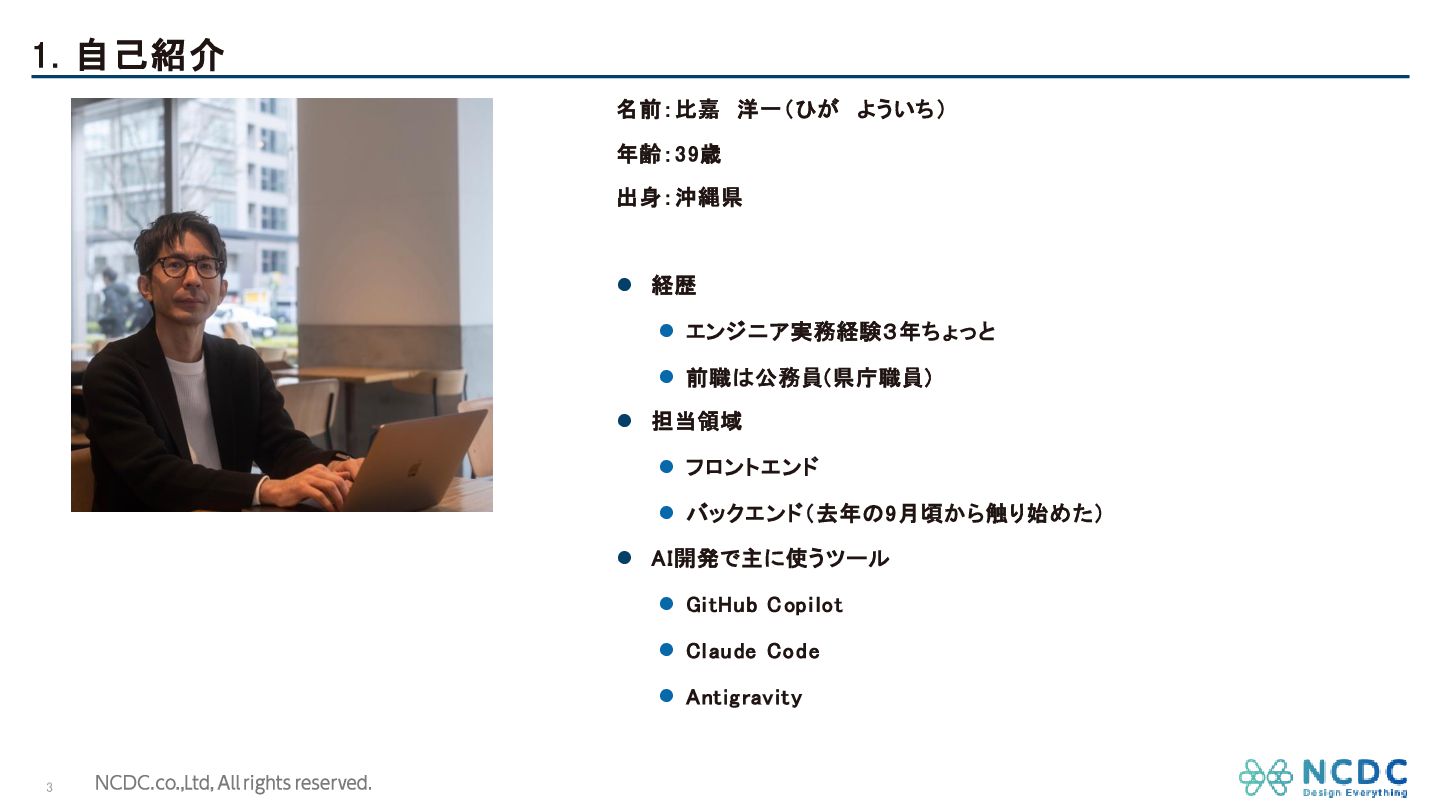エンジニア実務経験3年ちょっと ⚫ 前職は公務員(県庁職員) ⚫ 担当領域 ⚫ フロントエンド ⚫ バックエンド(去年の9月頃から触り始めた) ⚫ AI開発で主に使うツール ⚫ GitHub Copilot ⚫ Claude Code ⚫ Antigravity 3