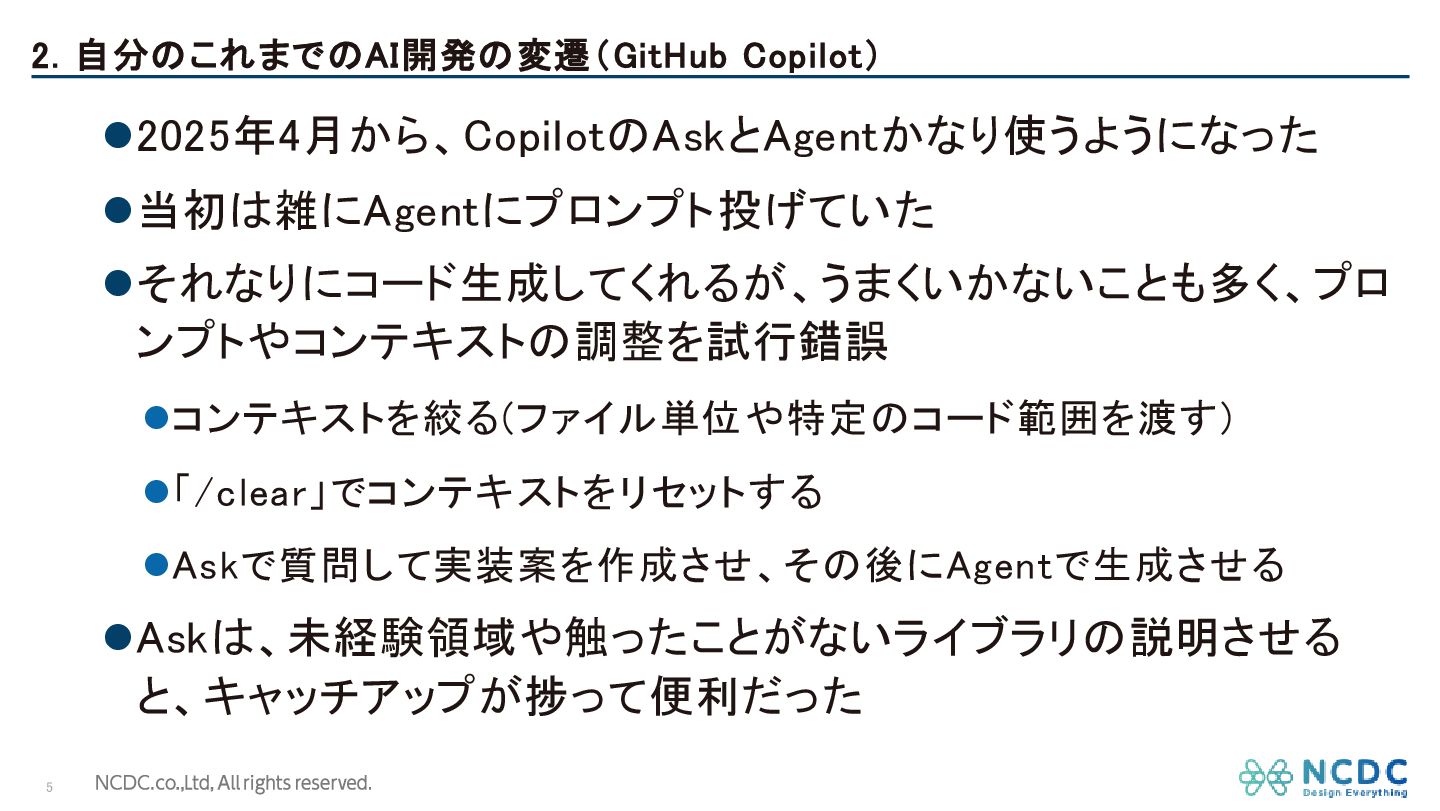 2. 自分のこれまでのAI開発の変遷(GitHub Copilot) 5 ⚫2025年4月から、CopilotのAskとAgentかなり使うようになった ⚫当初は雑にAgentにプロンプト投げていた ⚫それなりにコード生成してくれるが、うまくいかないことも多く、プロ ンプトやコンテキストの調整を試行錯誤 ⚫コンテキストを絞る(ファイル単位や特定のコード範囲を渡す) ⚫「/clear」でコンテキストをリセットする