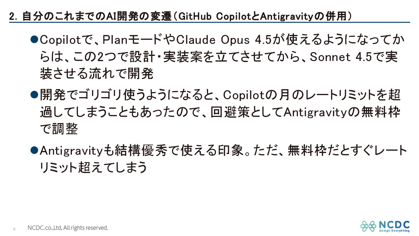 2. 自分のこれまでのAI開発の変遷(GitHub CopilotとAntigravityの併用) 6 ⚫Copilotで、PlanモードやClaude Opus 4.5が使えるようになってか らは、この2つで設計・実装案を立てさせてから、Sonnet 4.5で実 装させる流れで開発