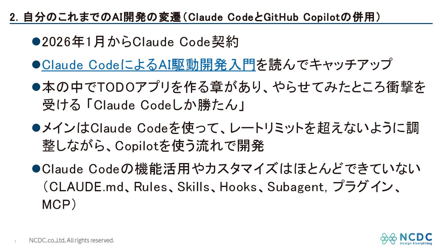 2. 自分のこれまでのAI開発の変遷(Claude CodeとGitHub Copilotの併用) 7 ⚫2026年1月からClaude Code契約 ⚫Claude CodeによるAI駆動開発入門を読んでキャッチアップ ⚫本の中でTODOアプリを作る章があり、やらせてみたところ衝撃を