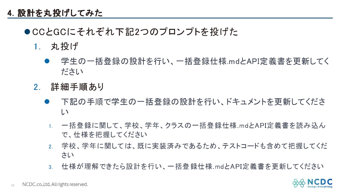 4. 設計を丸投げしてみた 10 ⚫CCとGCにそれぞれ下記2つのプロンプトを投げた 1. 丸投げ ⚫ 学生の一括登録の設計を行い、一括登録仕様.mdとAPI定義書を更新してく ださい 2.