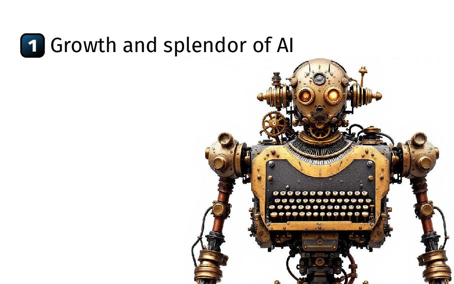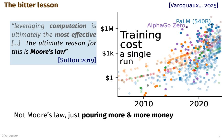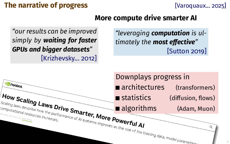 AI “leveraging computation is ul- timately the most effective” [Sutton 2019] G Varoquaux 7 “our results can be improved simply by waiting for faster GPUs and bigger datasets” [Krizhevsky... 2012] Downplays progress in architectures (transformers) statistics (diffusion, flows) algorithms (Adam, Muon)
