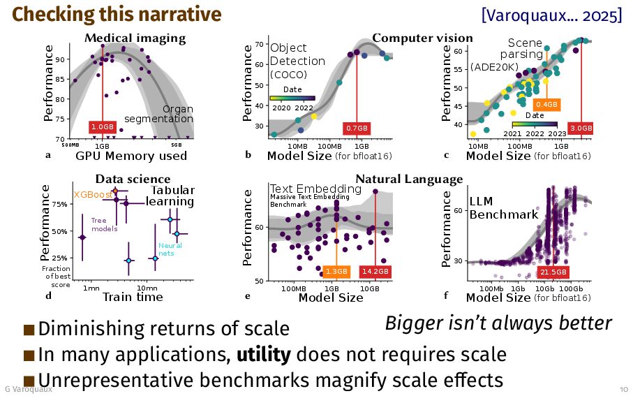 used 70 75 80 85 90 Performance Organ segmentation 1.0GB Medical imaging a 10MB 100MB 1GB Model Size 30 40 50 60 70 Performance (for bfloat16) Object Detection (COCO) 0.7GB 2020 2022 Date b 10MB 100MB 1GB Model Size 40 45 50 55 60 Performance (for bfloat16) Scene parsing (ADE20K) 3.0GB 0.4GB 2021 2022 2023 Date Computer vision c 1mn 10mn Train time 25% 50% 75% Performance XGBoost Neural nets Tree models Fraction of best score Tabular learning Data science d 100MB 1GB 10GB Model Size 50 60 Performance Text Embedding Massive Text Embedding Benchmark 14.2GB 1.3GB e 100Mb 1Gb 10Gb 100Gb Model Size 30 60 Performance (for bfloat16) LLM Benchmark 21.5GB Natural Language f Bigger isn’t always better Diminishing returns of scale In many applications, utility does not requires scale Unrepresentative benchmarks magnify scale effects G Varoquaux 10