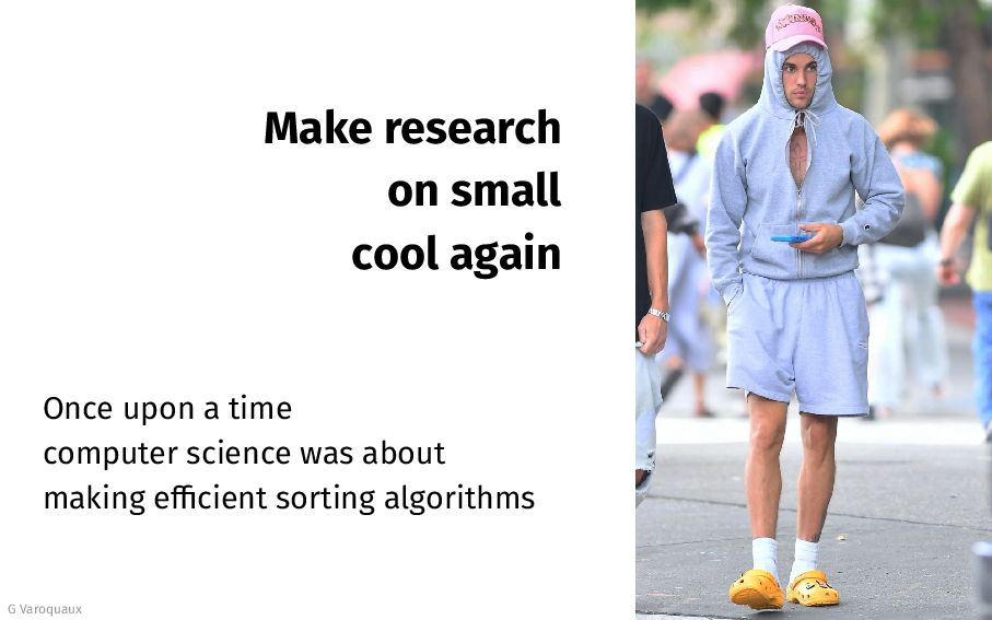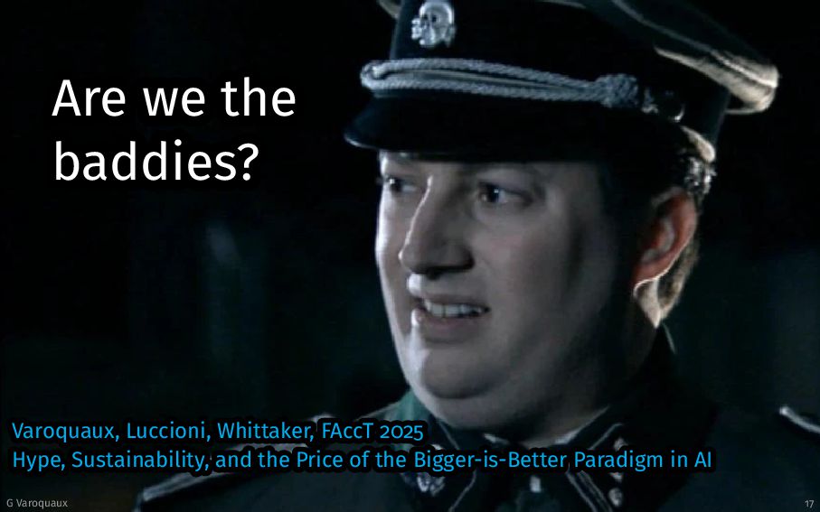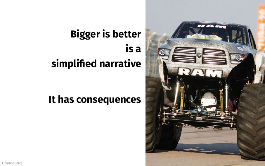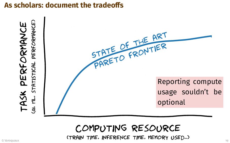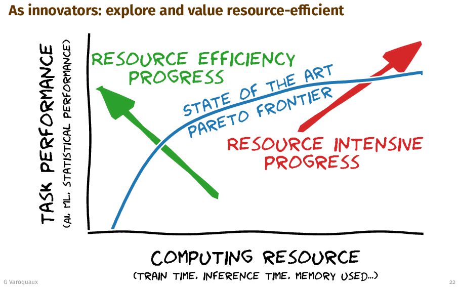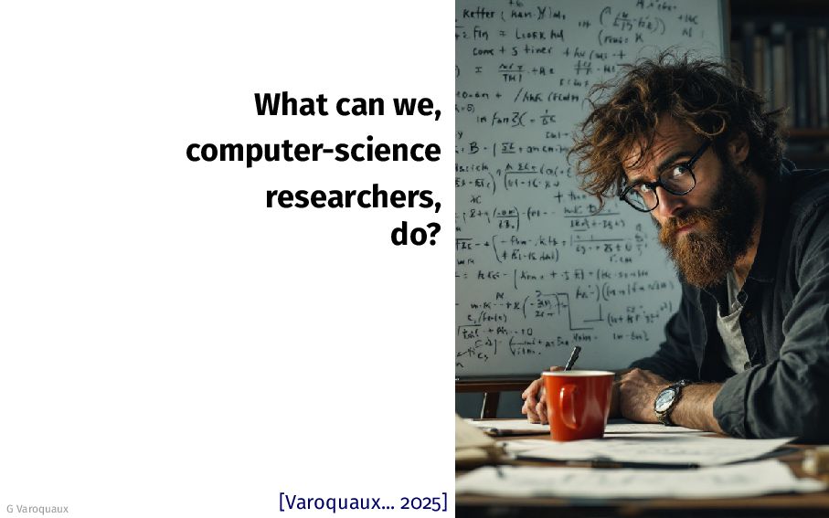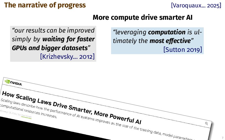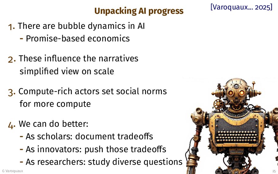 - Promise-based economics 2. These influence the narratives simplified view on scale 3. Compute-rich actors set social norms for more compute 4. We can do better: - As scholars: document tradeoffs - As innovators: push those tradeoffs - As researchers: study diverse questions G Varoquaux 25 [Varoquaux... 2025]