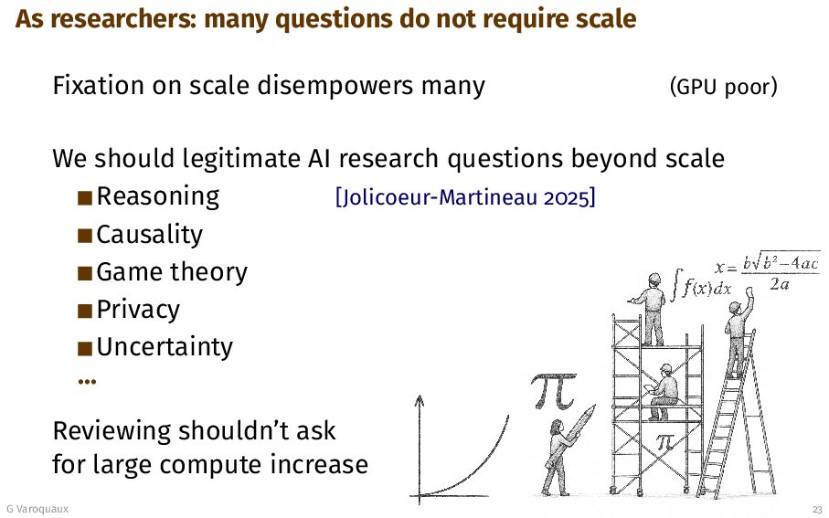 scale disempowers many (GPU poor) We should legitimate AI research questions beyond scale Reasoning [Jolicoeur-Martineau 2025] Causality Game theory Privacy Uncertainty ... Reviewing shouldn’t ask for large compute increase G Varoquaux 23