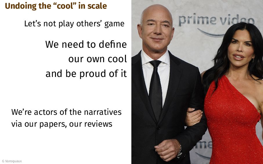 We need to define our own cool and be proud of it We’re actors of the narratives via our papers, our reviews G Varoquaux 24