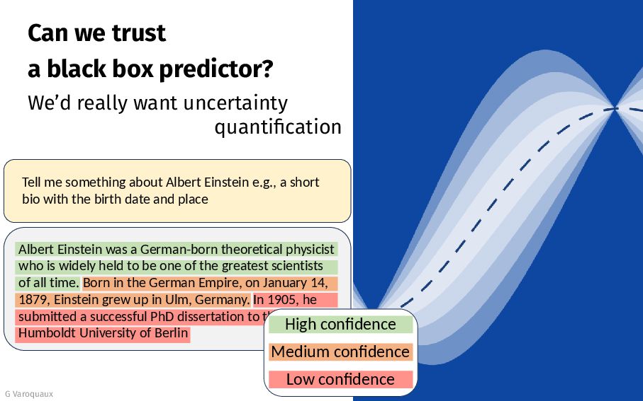 uncertainty quantification G Varoquaux 28 Tell me something about Albert Einstein e.g., a short bio with the birth date and place Albert Einstein was a German-born theoretical physicist who is widely held to be one of the greatest scientists of all time. Born in the German Empire, on January 14, 1879, Einstein grew up in Ulm, Germany. In 1905, he submitted a successful PhD dissertation to the Humboldt University of Berlin High confidence Medium confidence Low confidence