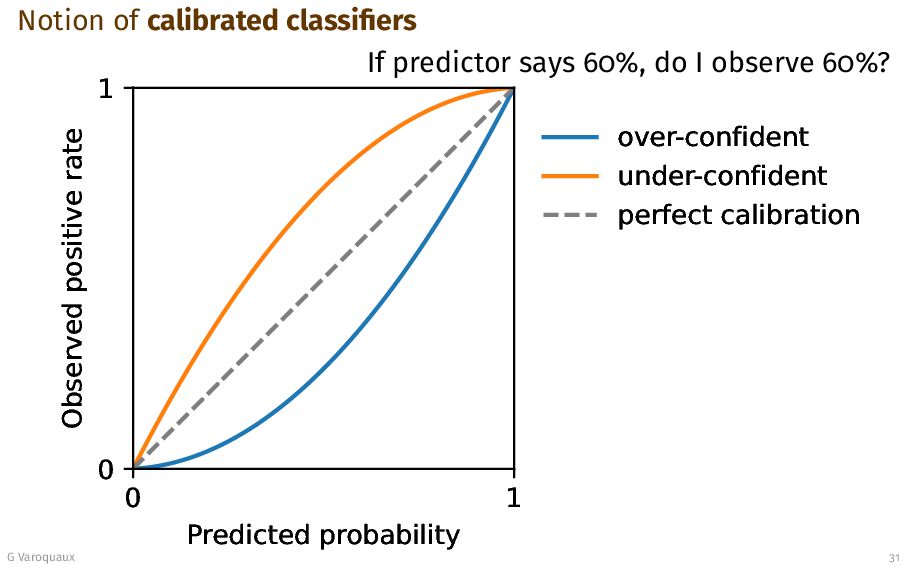 Observed positive rate over-confident under-confident perfect calibration If predictor says 60%, do I observe 60%? G Varoquaux 31