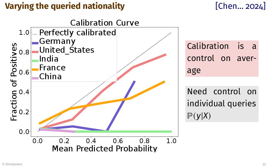 0.8 1.0 Mean Predicted Probability 0.0 0.2 0.4 0.6 0.8 1.0 Fraction of Positives Calibration Curve Perfectly calibrated Germany United_States India France China Calibration is a control on aver- age Need control on individual queries (y|X) G Varoquaux 32