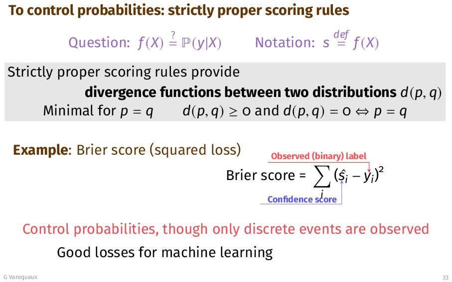 ? = (y|X) Notation: s def = f (X) Strictly proper scoring rules provide divergence functions between two distributions d(p, q) Minimal for p = q d(p, q) ≥ 0 and d(p, q) = 0 ⇔ p = q Example: Brier score (squared loss) Brier score = i ( ˆ si − yi )2 Observed (binary) label Confidence score Control probabilities, though only discrete events are observed Good losses for machine learning G Varoquaux 33