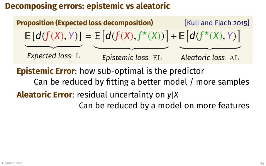 and Flach 2015] ¾[d(f (X), Y)] Expected loss: L = ¾ d(f (X), f⋆(X)) Epistemic loss: EL + ¾ d(f⋆(X), Y) Aleatoric loss: AL Epistemic Error: how sub-optimal is the predictor Can be reduced by fitting a better model / more samples Aleatoric Error: residual uncertainty on y|X Can be reduced by a model on more features G Varoquaux 34