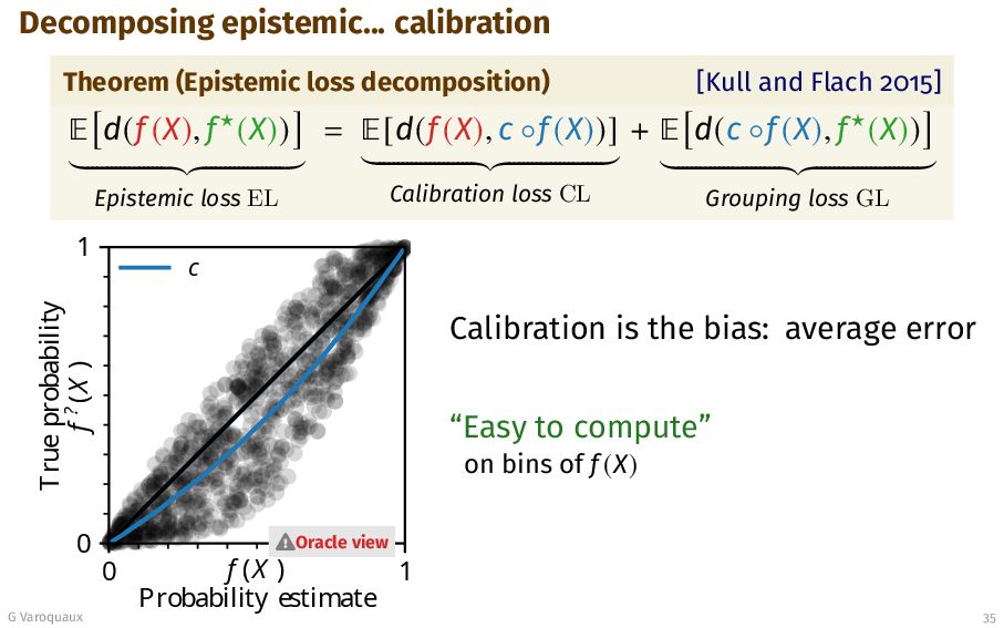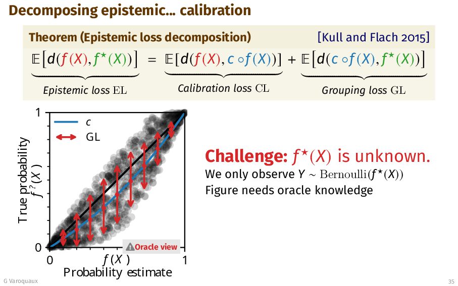 2015] ¾ d(f (X), f⋆(X)) Epistemic loss EL = ¾[d(f (X), c ◦f (X))] Calibration loss CL + ¾ d(c ◦f (X), f⋆(X)) Grouping loss GL 0 1 f (X ) Probability estimate 0 1 True probability f ? (X ) c GL Oracle view Challenge: f⋆(X) is unknown. We only observe Y ∼ Bernoulli(f⋆(X)) Figure needs oracle knowledge G Varoquaux 35